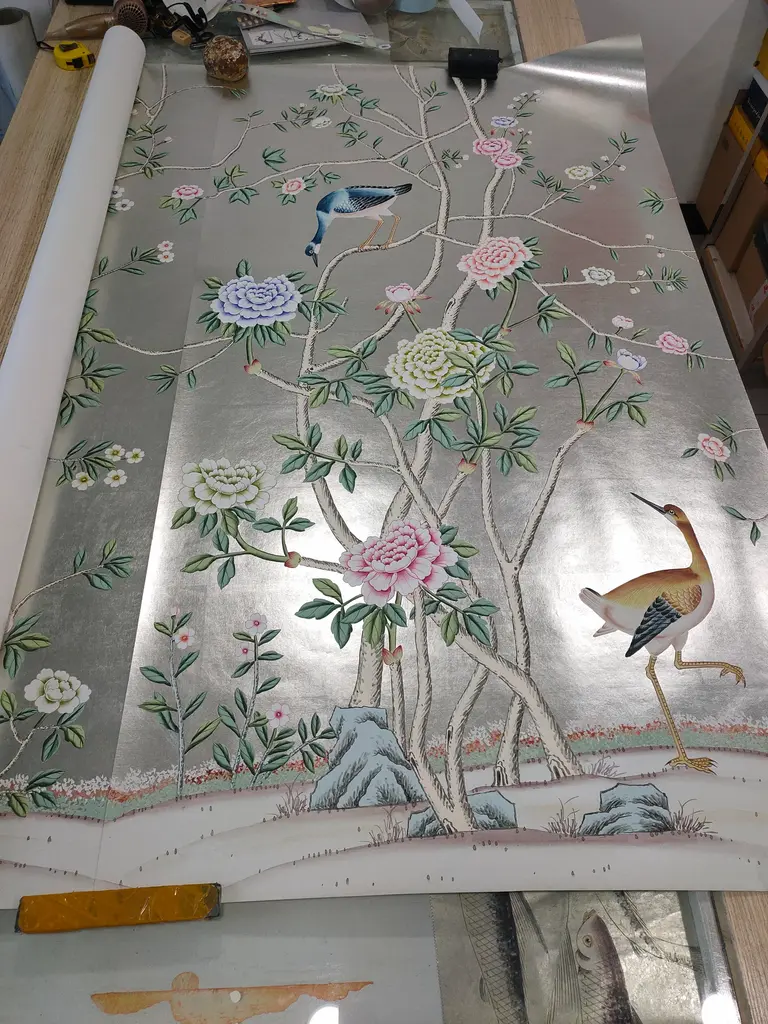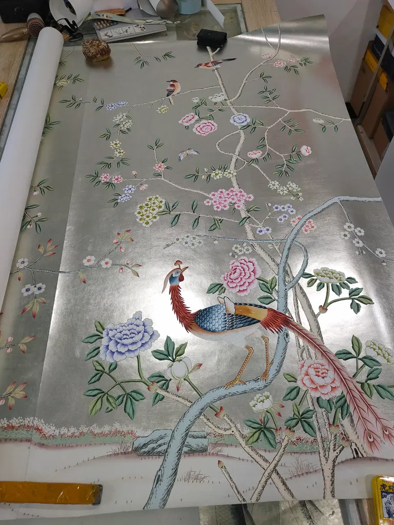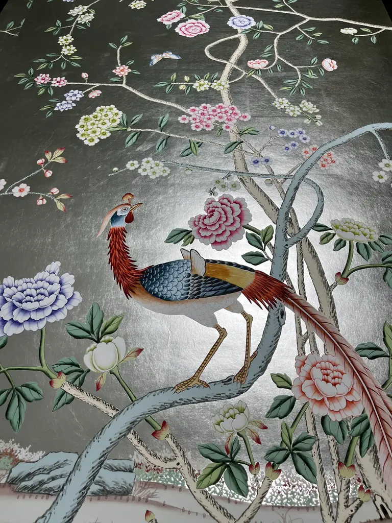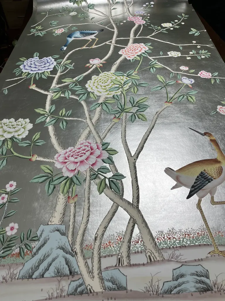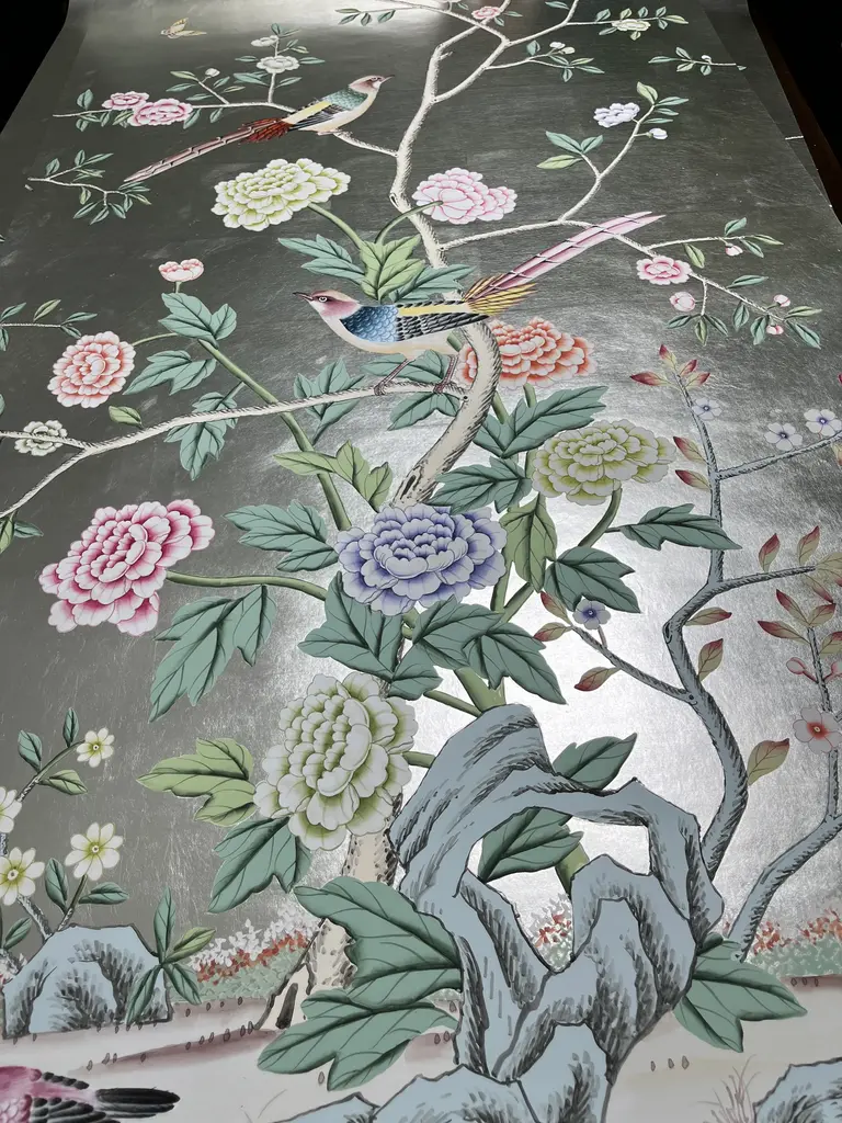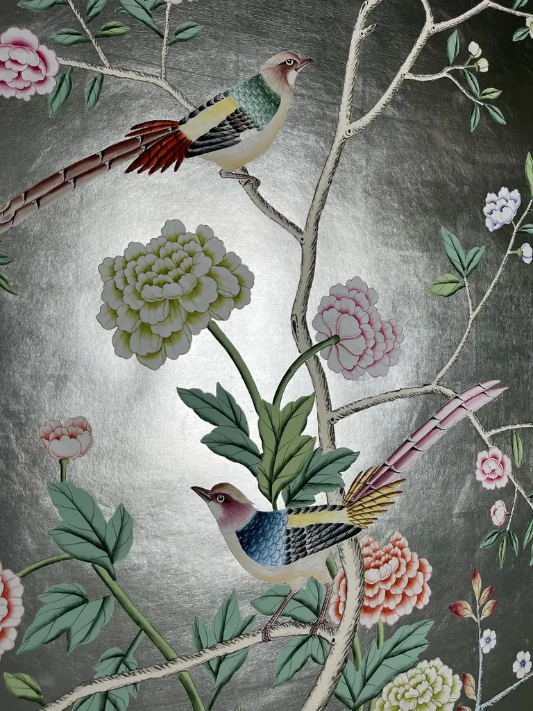 Chinoiserie Peony Hand Painted Wallpapers On Silver Metallic Panel - 4 Panels