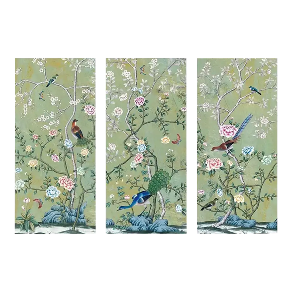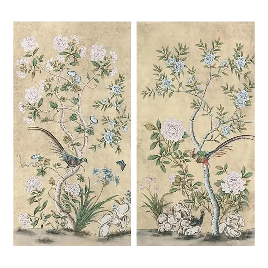 Chinoiserie mural depicts large flowers and birds in shades of white and beige on Royal Blue background. No. of Panels 5 - PW (Panel Width) 36" - DH (Design Height) 72" - PH (Panel Height) 84". Printed on MuralPro wallpaper.