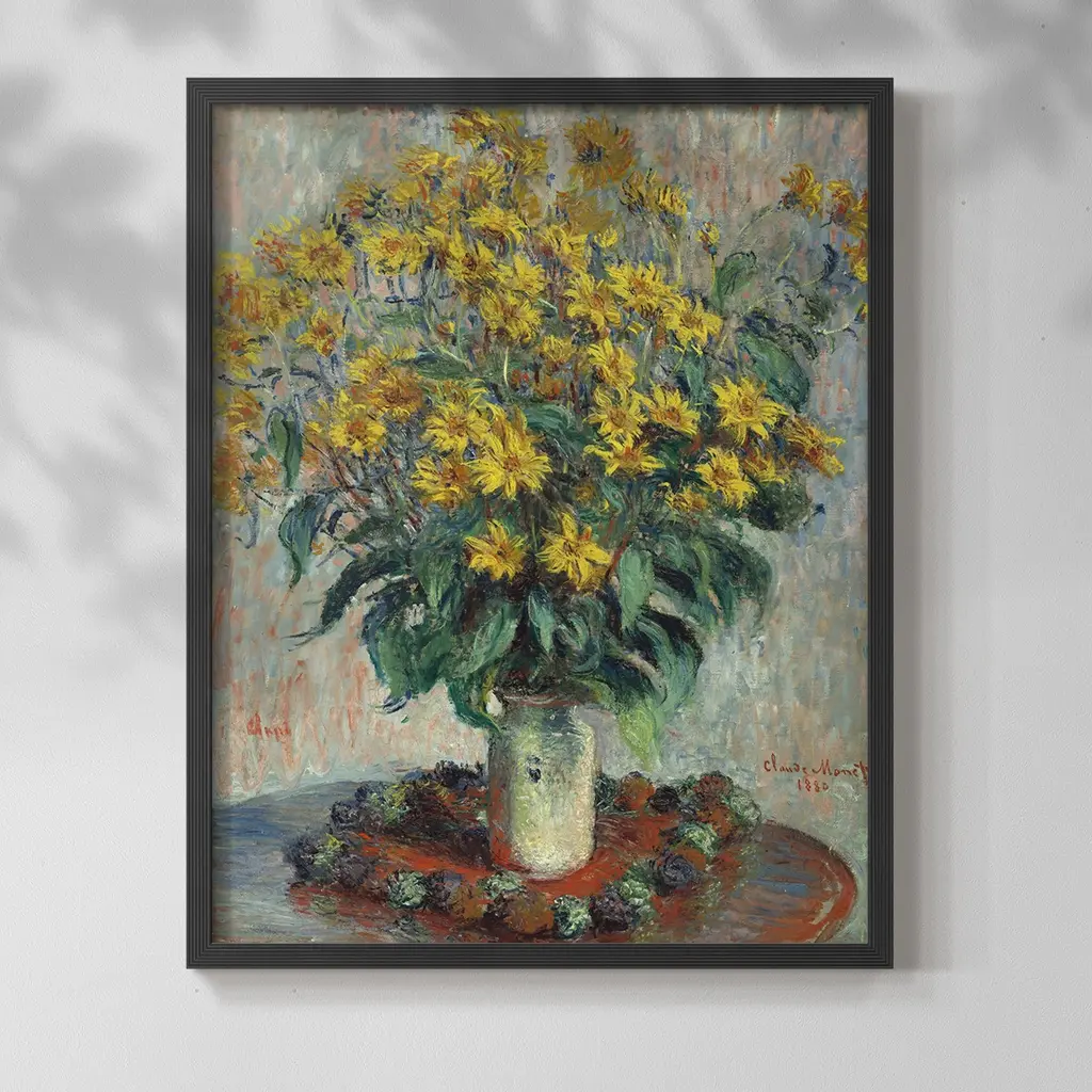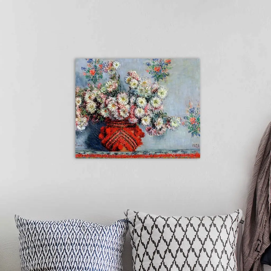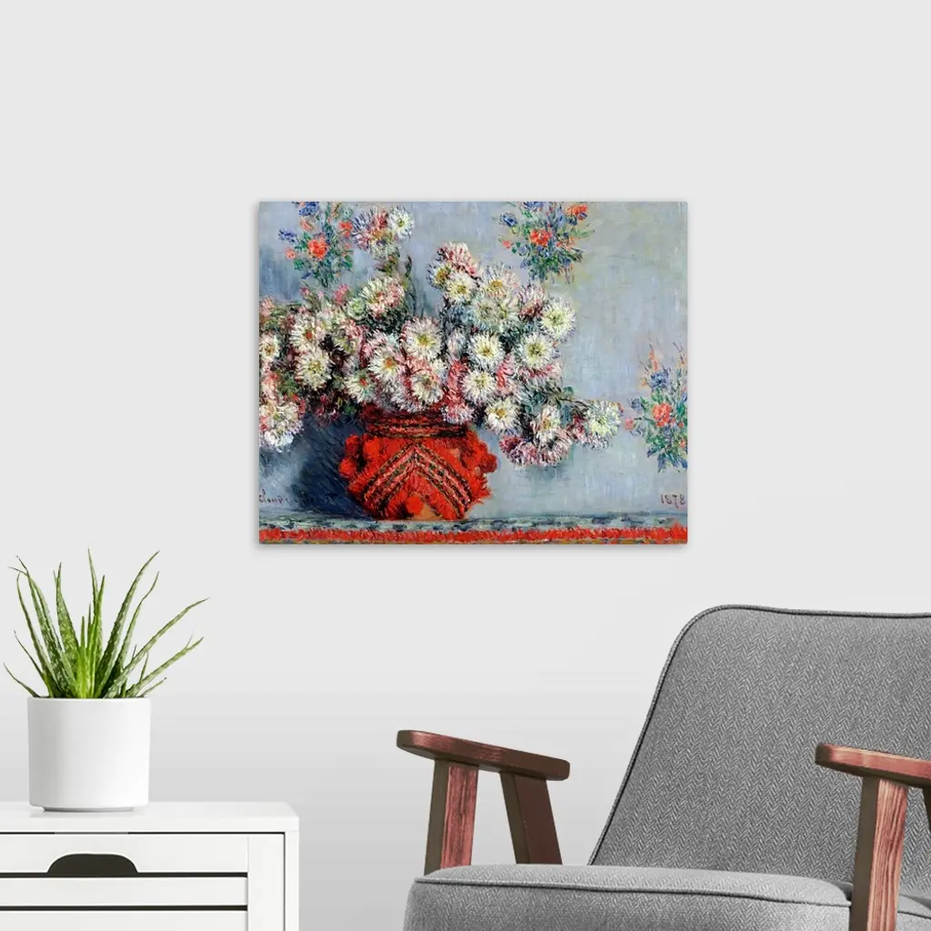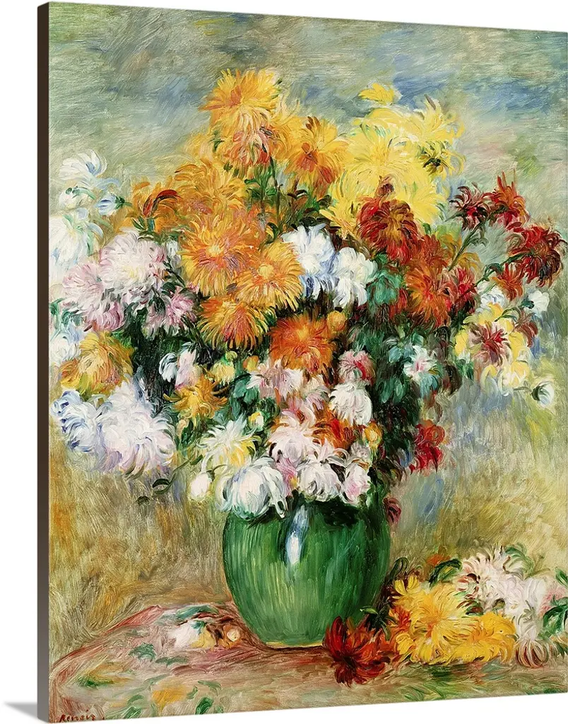 Large, landscape classical painting of a big vase full of chrysanthemums, against a floral, wallpapered background. The vase has a decorative, yarn covering over it. Painted with short, harsh brushstrokes.