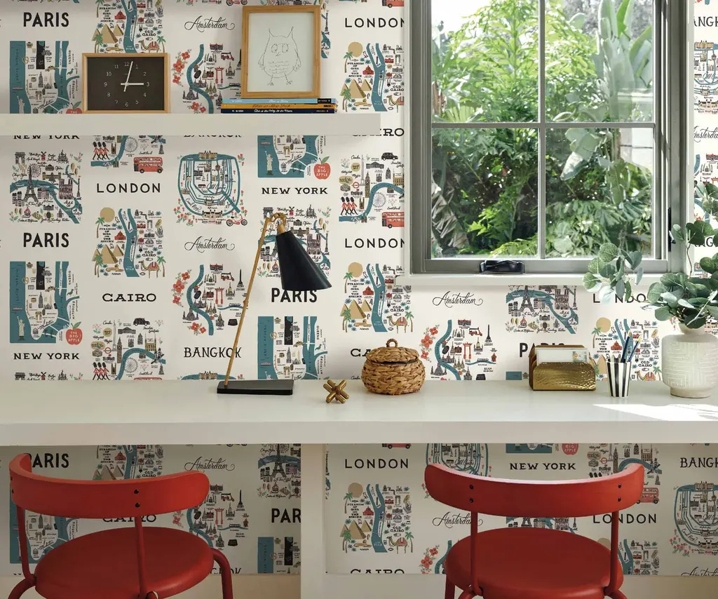 Travel the world without leaving home with this grid of illustrated city maps. Featuring our favorite destinations from New York to Tokyo, each illustration includes iconic landmarks, waterways and streets that celebrate each city's unique character. This peel & stick wallpaper can be easily removed, making it perfect for rentals and accent walls. The paper is gravure printed and comes in 27 inch rolls with a 24 inch repeat. Due to the printing process, there may be color variations in different print runs. We suggest purchasing all wallpaper needed for a project at one time for the best color consistency. Unopened rolls can be returned.
