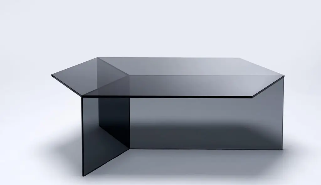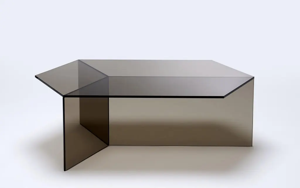 Clear glass "Isom Oblong" coffee table - Sebastian SchererDimensions: 40 H x 120 W x 69 D cmMaterials: Solid colored glassDifferent colors and sizes are availableThe Isom tables play with a fascinating optical illusion. The hexagonal glass panel is UV glued with three vertical foot elements whose edges, viewed from a certain angle, convey the perfect isometric drawing of a cube. A special detail are the CNC-ground double mitres and the seamless bonding of the foot elements. The different sizes and variants can be combined very well. The glass tables are available in four colors, each in clear glass and satined.The NEO/CRAFT label was founded by the Berlin-based designer Sebastian Scherer after he won the Lexus Design Award 2014 for his Iris lamp (2013). The debut collection, which consisted of ten products, was first presented at the imm cologne in January 2015 in what Wallpaper Magazine described as “one of the most impressive debuts in 2015.” Exhibitions at trade fairs in Milan and London followed this same year. Since then, Sebastian Scherer has worked as a designer and creative director in equal measure. The collection consists of his designs, but these can also undergo further development in the future through the input of other designers. The central element in his developmental process is the continual search for new creative possibilities with classical materials such as aluminum, steel, glass and wood.