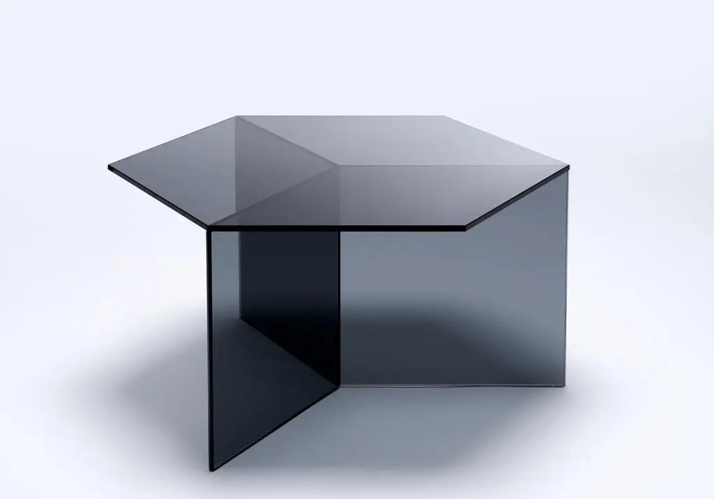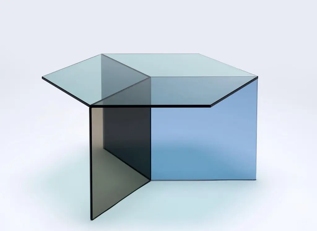 Clear glass "Isom Square" coffee table - Sebastian SchererDimensions: 40 H x 80 W x 69 D cmMaterials: Solid coloured glassDifferent colors and sizes are availableThe Isom tables play with a fascinating optical illusion. The hexagonal glass panel is UV glued with three vertical foot elements whose edges, viewed from a certain angle, convey the perfect isometric drawing of a cube. A special detail are the CNC-ground double mitres and the seamless bonding of the foot elements. The different sizes and variants can be combined very well. The glass tables are available in four colors, each in clear glass and satined.The NEO/CRAFT label was founded by the Berlin-based designer Sebastian Scherer after he won the Lexus Design Award 2014 for his Iris lamp (2013). The debut collection, which consisted of ten products, was first presented at the imm cologne in January 2015 in what Wallpaper Magazine described as “one of the most impressive debuts in 2015.” Exhibitions at trade fairs in Milan and London followed this same year. Since then, Sebastian Scherer has worked as a designer and creative director in equal measure. The collection consists of his designs, but these can also undergo further development in the future through the input of other designers. The central element in his developmental process is the continual search for new creative possibilities with classical materials such as aluminum, steel, glass and wood.