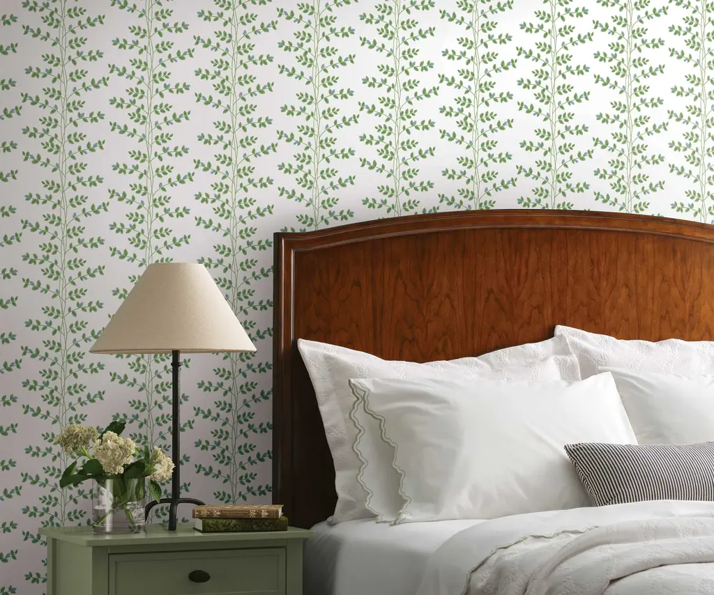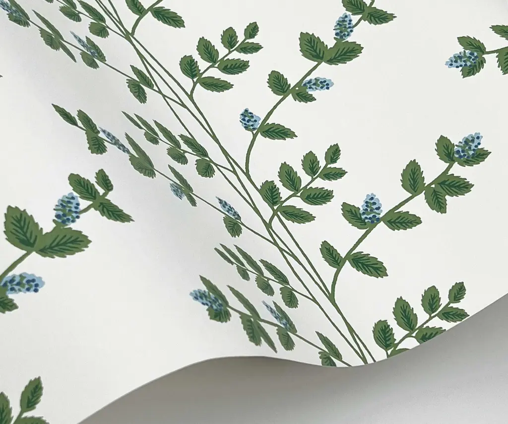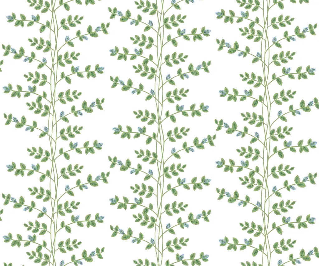 Climbing Vines is a design of delicate leaves growing in a botanical take on a vertical stripe, dotted with little white flowers. This wallpaper is screen printed and comes in 27 inch rolls with a 24.25 inch repeat. Due to the printing process, there may be color variations in different print runs. We suggest purchasing all wallpaper needed for a project at one time for the best color consistency. Unopened rolls can be returned.