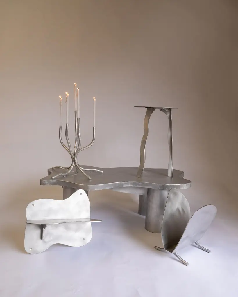 Joseph Ellwood is a British designer and maker, he has been named one of 10 'Future Icons' in design by Wallpaper magazine, collaborated with the luxury brand Rimowa and embarked on numerous exciting projects for 2023. He set up his design and manufacture studio: Six Dots Design in 2020A dose of fun into any living room, our new coffee table is an elevated take on our classic table design. Each of these pieces is hand made by artist and designer Joseph Ellwood. Each will be marked for authenticity.Each of our pieces are made from raw finished aluminium, a material that can be readily reused and recycled. This recyclability, coupled with new low carbon cathode technologies, make aluminium a sustainably plausible material for the future.The aesthetic of our work aims to challenge and disrupt the mid-century norms of furniture today. I have taken inspiration from the likes of Perriand and Prouvé and distorted their pieces to create a body of work that relates to our current generation. The lives we live today are fluid in gender, identity, expression and thought. Our work represents this confusion, indecision and anxiety in a whimsical and endearing way.Each of our pieces is hand made to order, therefore slight variation from object to object can be expected.