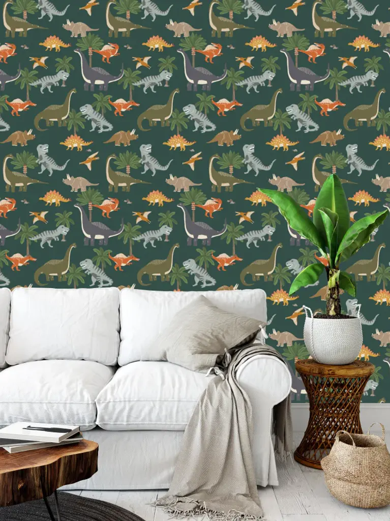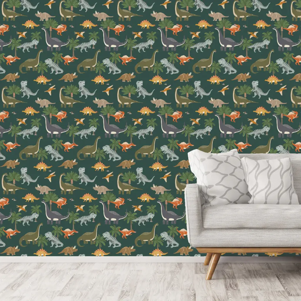 Colorful Dinosaurs On Green Wallpaper By Erin Kendal, 24"x72"