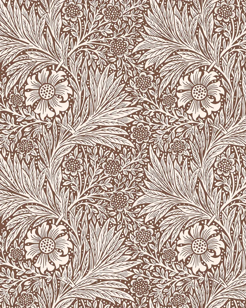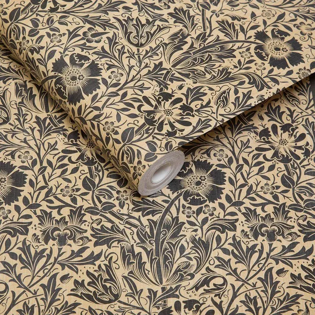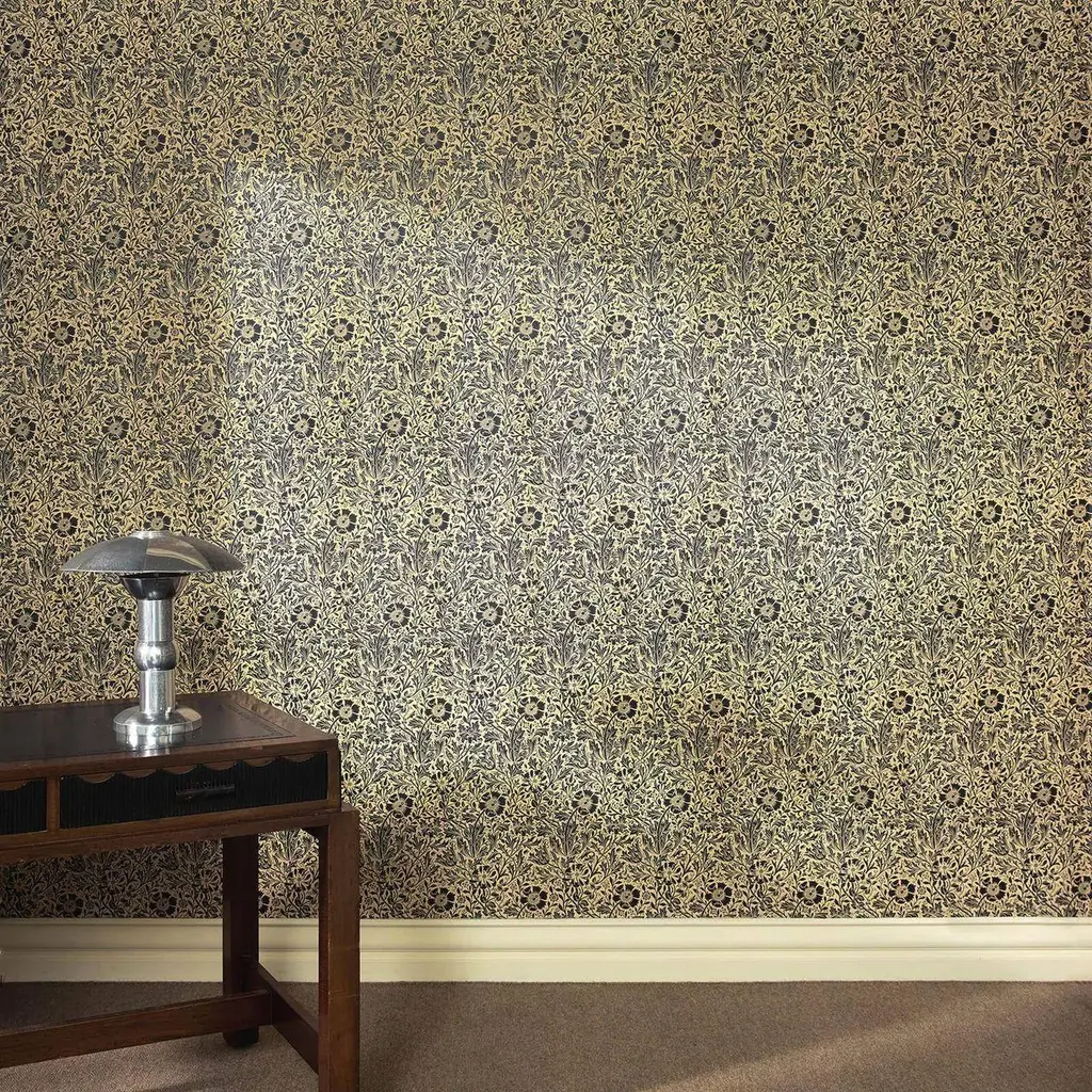 A nod to the noble craft of blackwork, COMPTON PARVUM is a scaled down version of William Morris’ classic block printed design. Designed in collaboration with LA design house Pierce & Ward, delicate acanthus leaves, tulips and poppies are emboldened by their inky linework, silhouetted against a backdrop of flaxen gold.