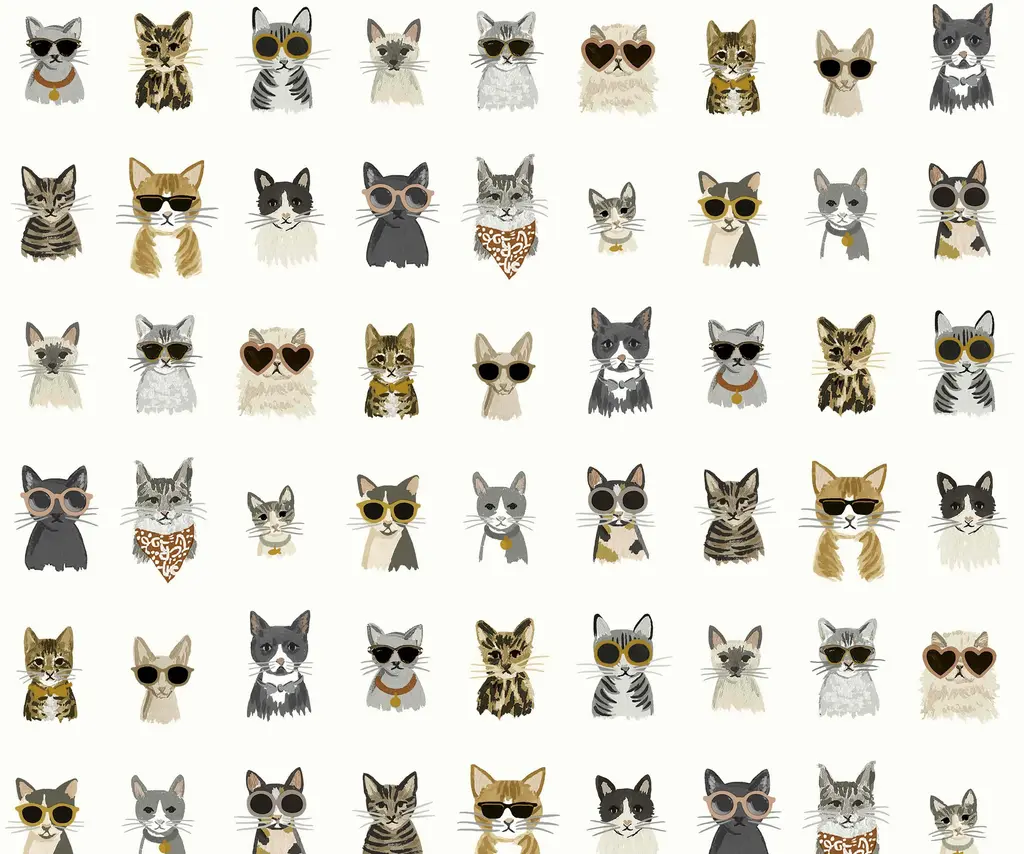 Feline friends in their favorite accessories. Celebrate your favorite kitty with our Cool Cats wallpaper. This peel & stick wallpaper can easily be removed, making it perfect for rentals and accent walls. The paper is gravure printed and comes in 27 inch rolls with a 24 inch repeat. Due to the printing process, there may be color variations in different print runs. We suggest purchasing all wallpaper needed for a project at one time for the best color consistency. Unopened rolls can be returned.