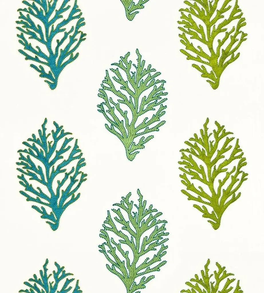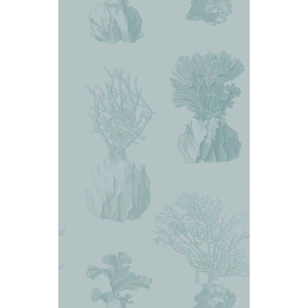 Sun print vibes meet a seaside sensibility in Coral Grove, a wallpaper featuring delicate coral silhouettes against a sponge-paint-like blue backdrop. This wallcovering isn't just for beach cottages; it's also fantastic in any classic space.