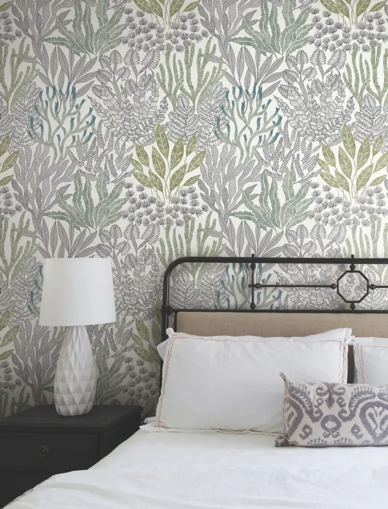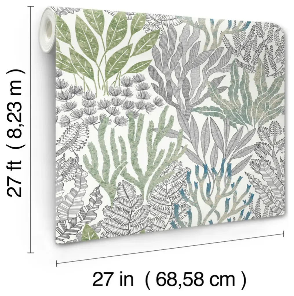Coral Leaves reimagines the sea floor with a combination simple black and white linework and unframed blue, green, and cream fronds. This Coral Leaves Wallpaper measures approximately 27 inches wide by 27 feet long, measuring approximately 60.8 square feet per roll. The quintessential design for timeless romance, toile traces its origins to 18th century fabrics. This celebrated motif is explored with a range of classical reproductions and modern reimaginings. Unpasted non woven material; 25.25-in repeat, straight match; Washable and strippable; 27-in by 27-ft long roll; Covers about 60.8 square feet