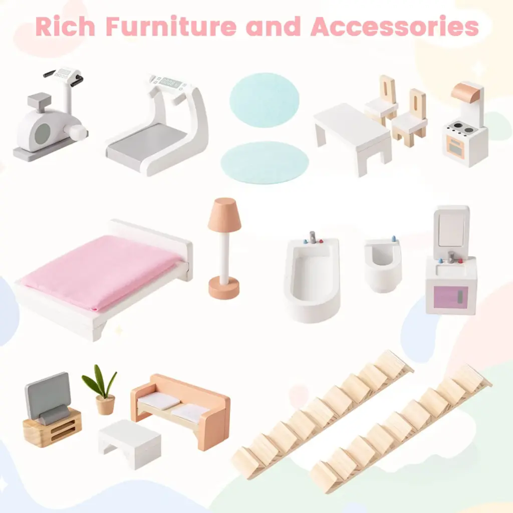 Delight your little ones with this kids wooden dollhouse! This wooden doll house includes a home gym, bedroom, bathroom, dining room, and living room, each adorned with lifelike wallpaper for a realistic touch. The roofs are removable and reversible, enhancing the playtime. Complete with an array of furniture and accessories, the pretend house will provide your child with an immersive play experience. This dollhouse playset is a great present for children aged 3 years old and up, promoting imagination, coordination, and social skills. Additionally, the snap-in design ensures hassle-free assembly for time and effort saving.FeaturesDouble-sided roofs are removable for ungraded creativity and versatility Include a home gym, bedroom, bathroom, dining room and living room for fun Each room is designed with lifelike wallpaper to provide realistic room scenes Come with rich furniture and accessories for endless fun of DIY Tool-free assembly with a unique snap-in design to save you time and effort Awesome gift for children aged 3+ years old on any special occasion Good for imagination, color recognition, social skills and parent-child interactionColor: Multicolor Materials: MDF, Pine Wood, Plywood Product Dimensions: 22" x 14" x 26" (L x W x H) Distance Between 2 Floors: 8.5" Net Weight: 21 lbs Suitable Ages: 3+ Years Old Package Includes: 1 x Wooden Dollhouse 19 x Furniture and Accessories 1 x Instruction