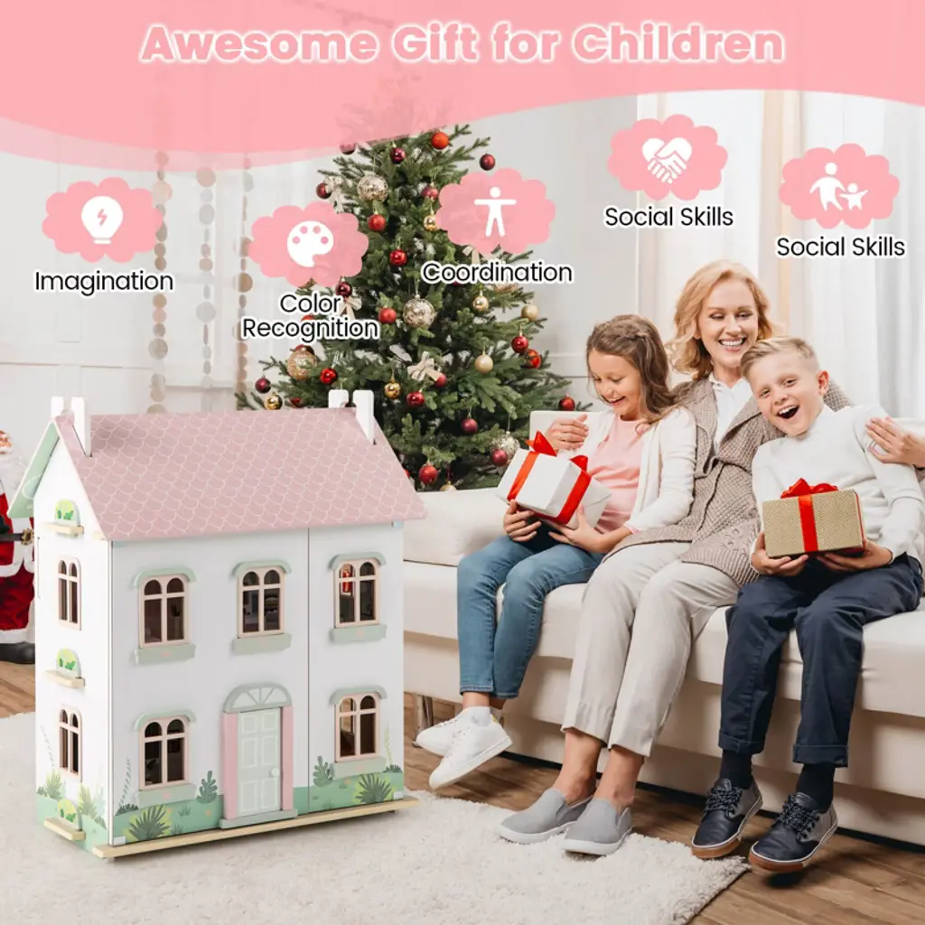 Costway Kids Wooden Dollhouse With Double-sided Roofs & Openable Doors Rich Furniture
