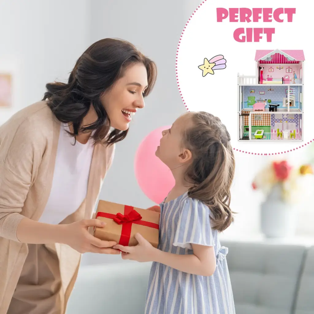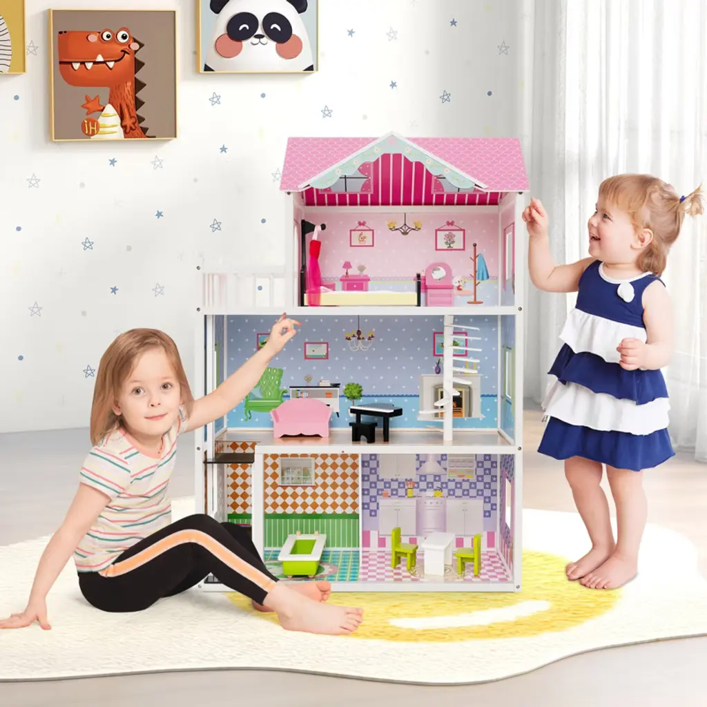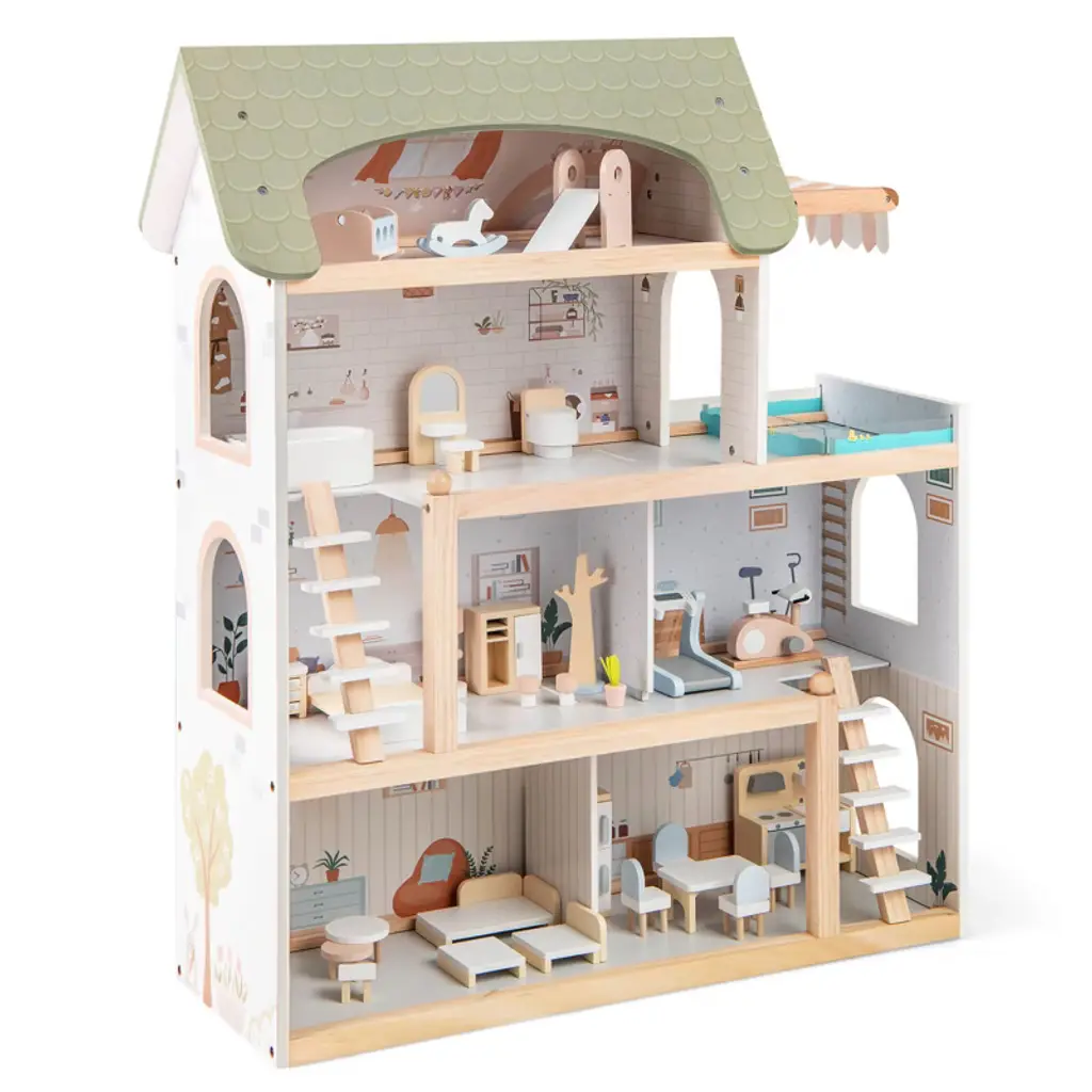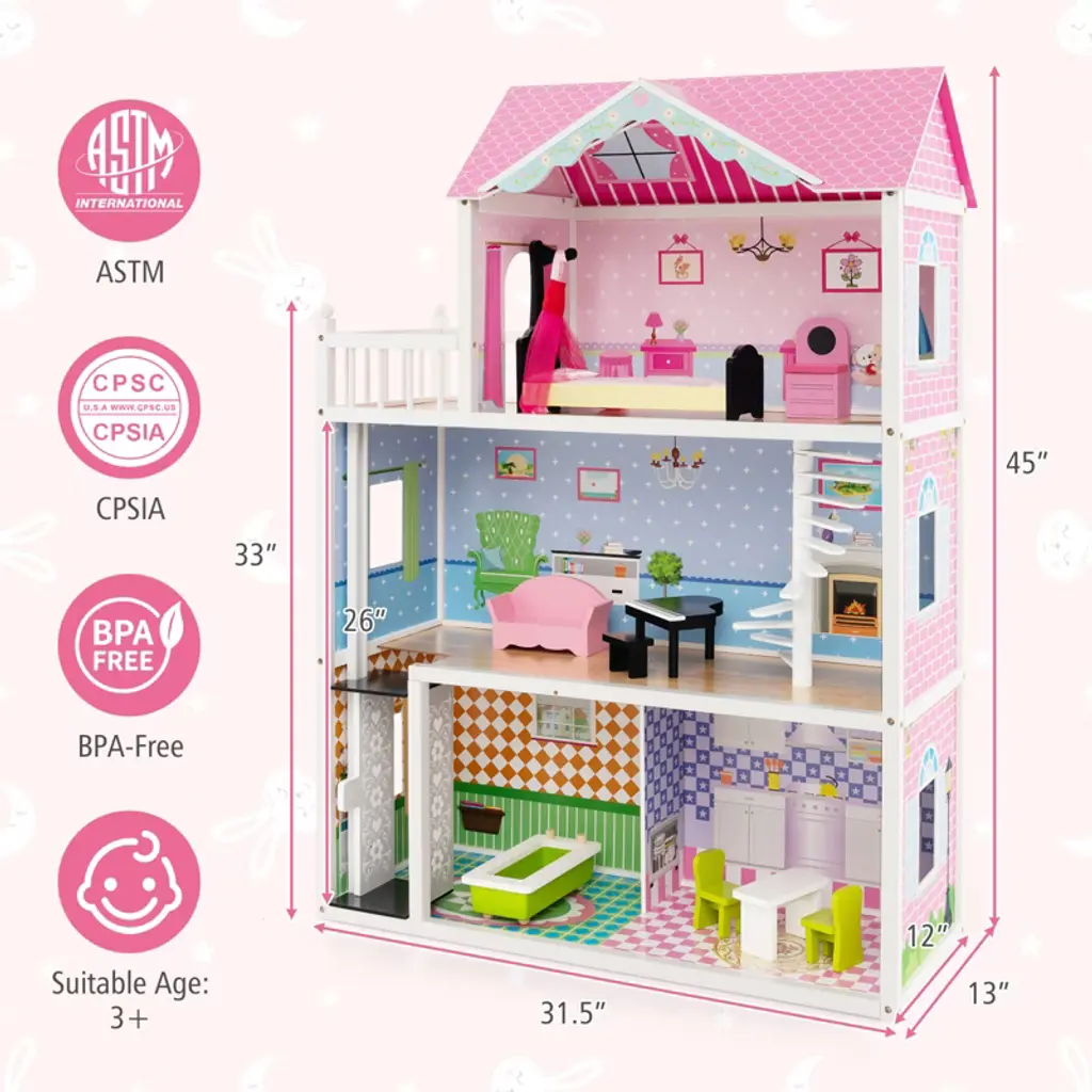Enjoy endless fun with this wooden dollhouse. It is equipped with 5 rooms and comes with 10 furniture accessories, bringing chance for experiencing a complete day. Dolls can play the piano in the living room at 9: 00, prepare lunch in the kitchen at 12: 00, enjoy the scenery on the balcony at 15: 00, take a bath in bathroom at 20: 00 and go to bed in the bedroom at 22: 00. Note: each floor can accommodate 10” dolls. What’s more, the working elevator brings dolls to different floors easily, and the adjustable staircase brings extra fun. The pretend playhouse is a perfect gift for kids and helps enhance hands-on ability, creativity, parent-child interaction and more.FeaturesIncluding living room, bedroom, kitchen, bathroom, balcony 10 pieces accessories allow toddler to create their ideal house Doll can take the working elevator to the first and second floors Long staircase with adjustable steps offers children much fun Helping promote parent-child interaction, hands-on ability, etc BPA-free materials and ASTM and CPSIA certifications for security Nice gift for children over 3 years old on birthday, Christmas, etc Equipped with arched door, adorable eave, exquisite wallpaper, etcColor: As Pictures Show Material: Pine Wood, MDF Overall Dimension: 31.5” x 13” x 45” (L x W x H) Distance Between Each Story(from Top to Bottom): 14.5”/ 12.5”/12.5” Suitable Age: 3 + Years Old Recommended Height: 3.3ft-4.6 ft Suitable Doll Size: No More than 10 Inches Net Weight: 24 lbs Package includes: 1 x Dollhouse 1 x User Manual