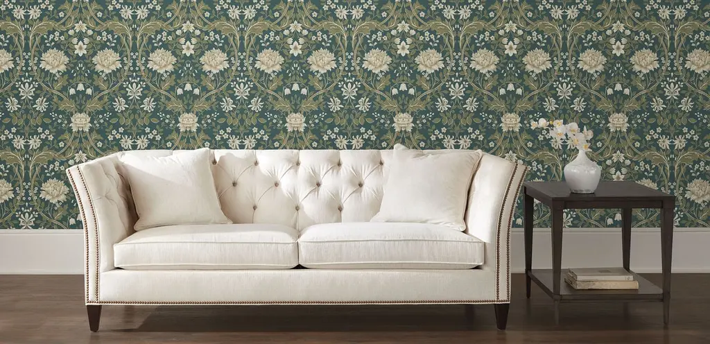 Mixed flowers bloom symmetrically atop this floral wallpaper's navy background. Each ivory bud is highlighted and shaded to create a hint of realism in a geometric arrangement that brings visual peace to any room.