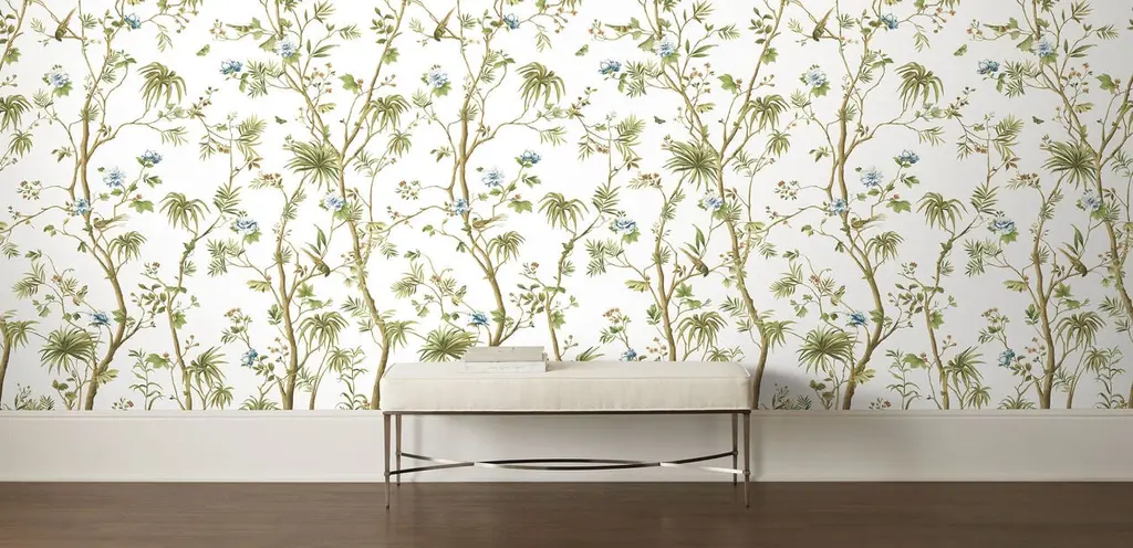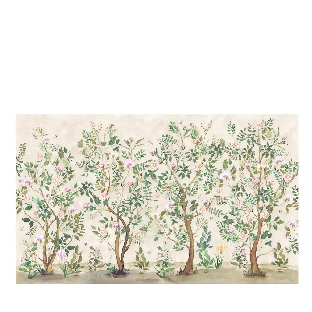 A little bit of everything—palms, florals, berries, fauna—is harmoniously interwoven onto our Danielle wall mural. It's a unique grasscloth, a modern take on chinoiserie, and a joyful way to brighten any accent wall.