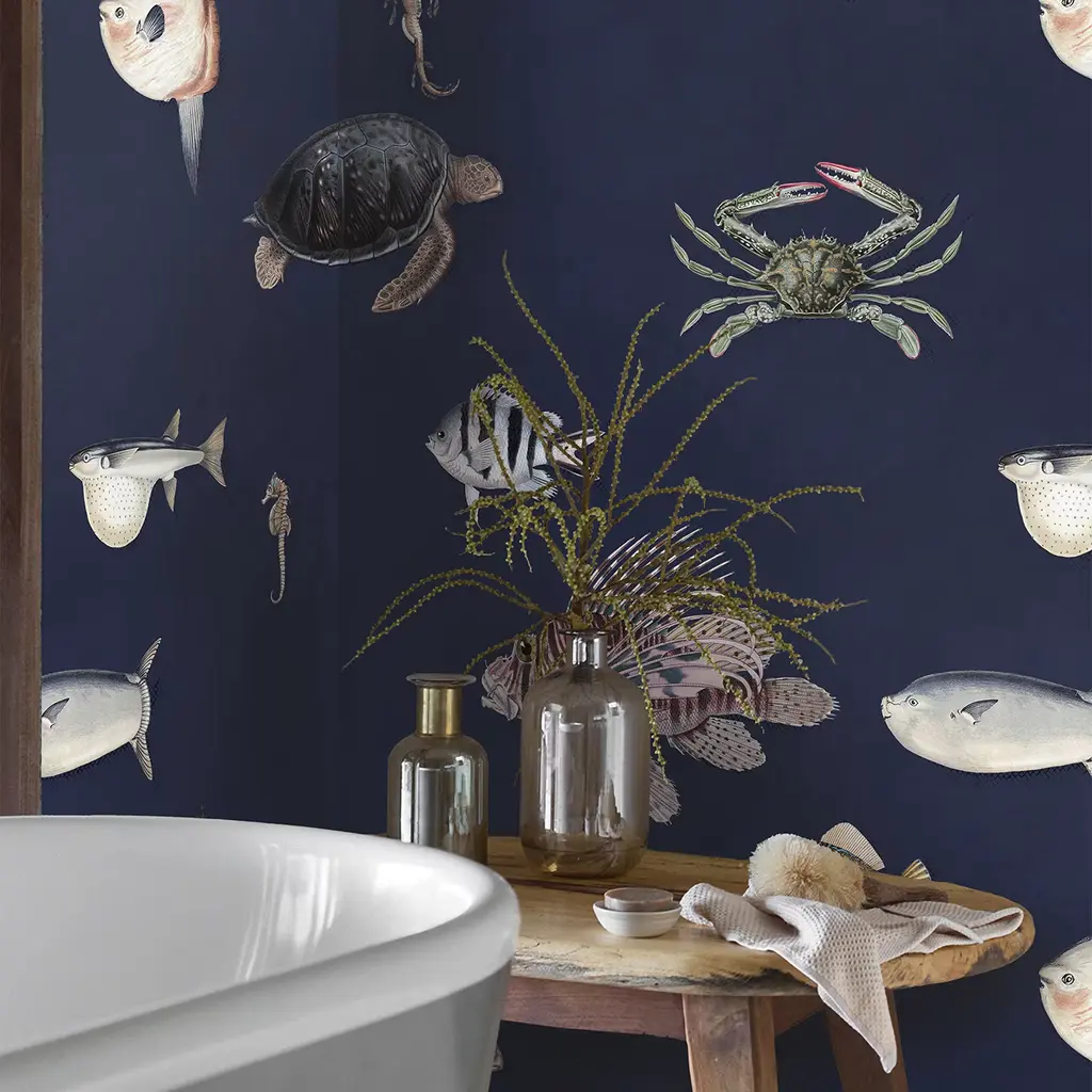 The wallpaper is made from 100% ecological paper, printed with vegan, water-based inks, and free from chemicals and solvents. Each package contains eight sheets. Inspired by 18th-century English tradition and printed in Italy, it's perfect for walls, shelves, and furniture. The design features a vintage tropical fishes print, hand-drawn on a blue background. Each sheet measures 27.5x39.4 inches/70x100 cm, covering a total area of 5 MQ.