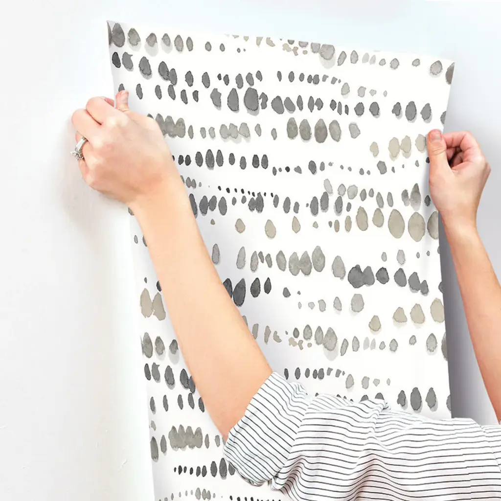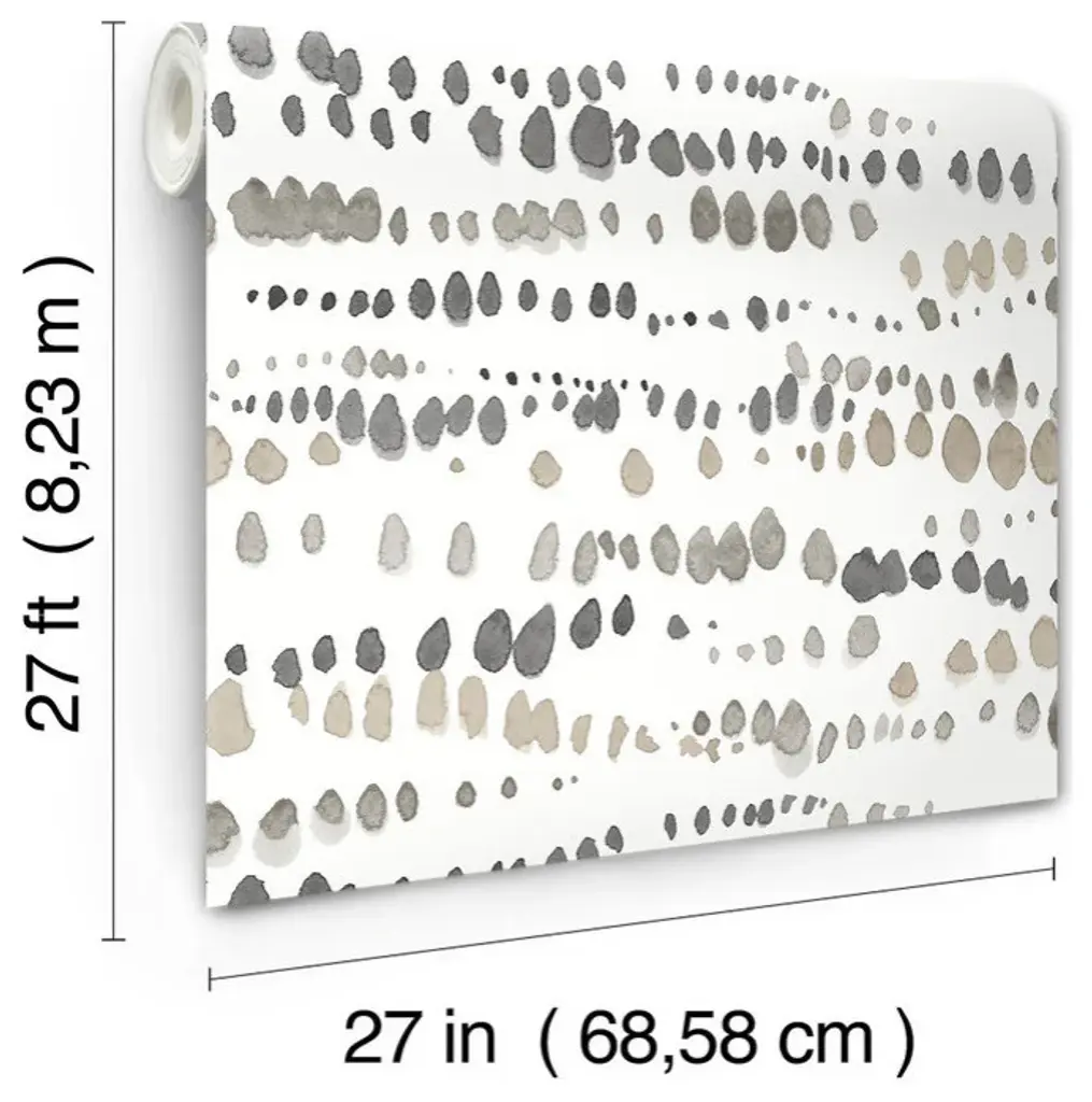 Rows of black, grey, and taupe watercolors add decorative drips in artistically refined Dewdrops. This Dewdrops Wallpaper measures approximately 27 inches wide by 27 feet long, measuring approximately 60.8 square feet per roll. Artistic experimentation with the interplay of form, color and texture has led to an avant-garde reimagining of familiar design motifs. Unpasted non woven material; 24-in repeat, straight match; Washable and strippable; 27-in by 27-ft long roll; Covers about 60.8 square feet