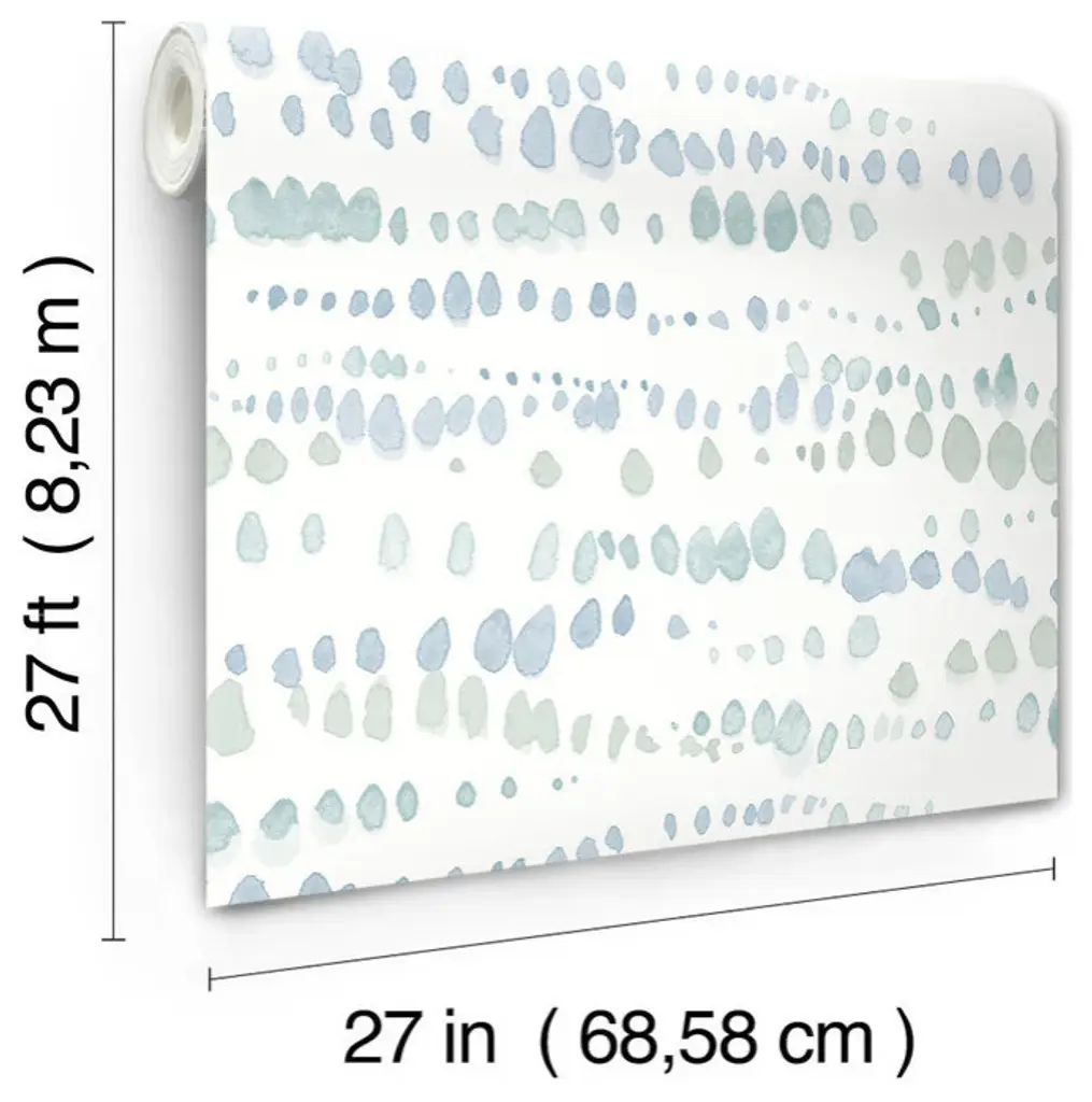 Rows of sea green, blue, and aqua watercolors add decorative drips in artistically refined Dewdrops. This Dewdrops Wallpaper measures approximately 27 inches wide by 27 feet long, measuring approximately 60.8 square feet per roll. Artistic experimentation with the interplay of form, color and texture has led to an avant-garde reimagining of familiar design motifs. Unpasted non woven material; 24-in repeat, straight match; Washable and strippable; 27-in by 27-ft long roll; Covers about 60.8 square feet