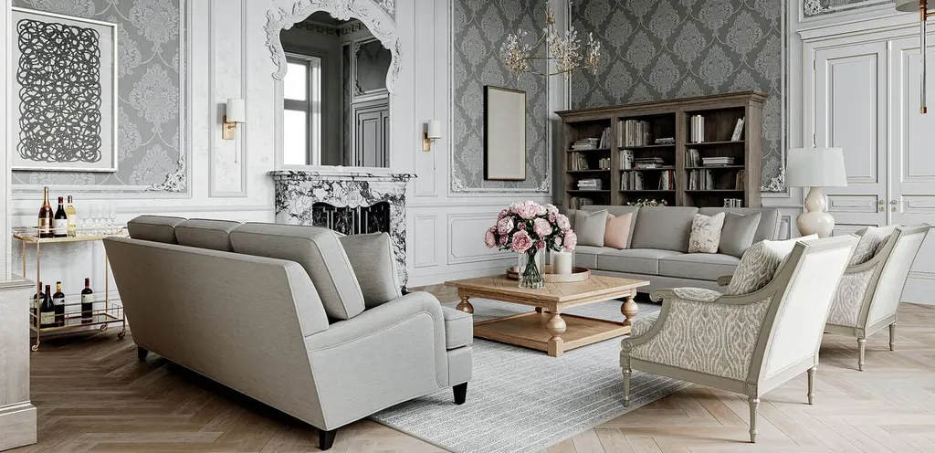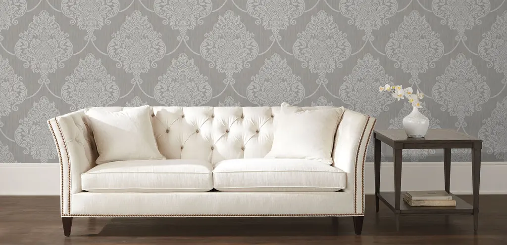 Damask wallpaper is a selection that's always timeless. Dillon features a large-scale pattern over a faux-grasscloth background; raised ink and a slight reflective quality give it texture, but it's made from easy-to-clean materials.