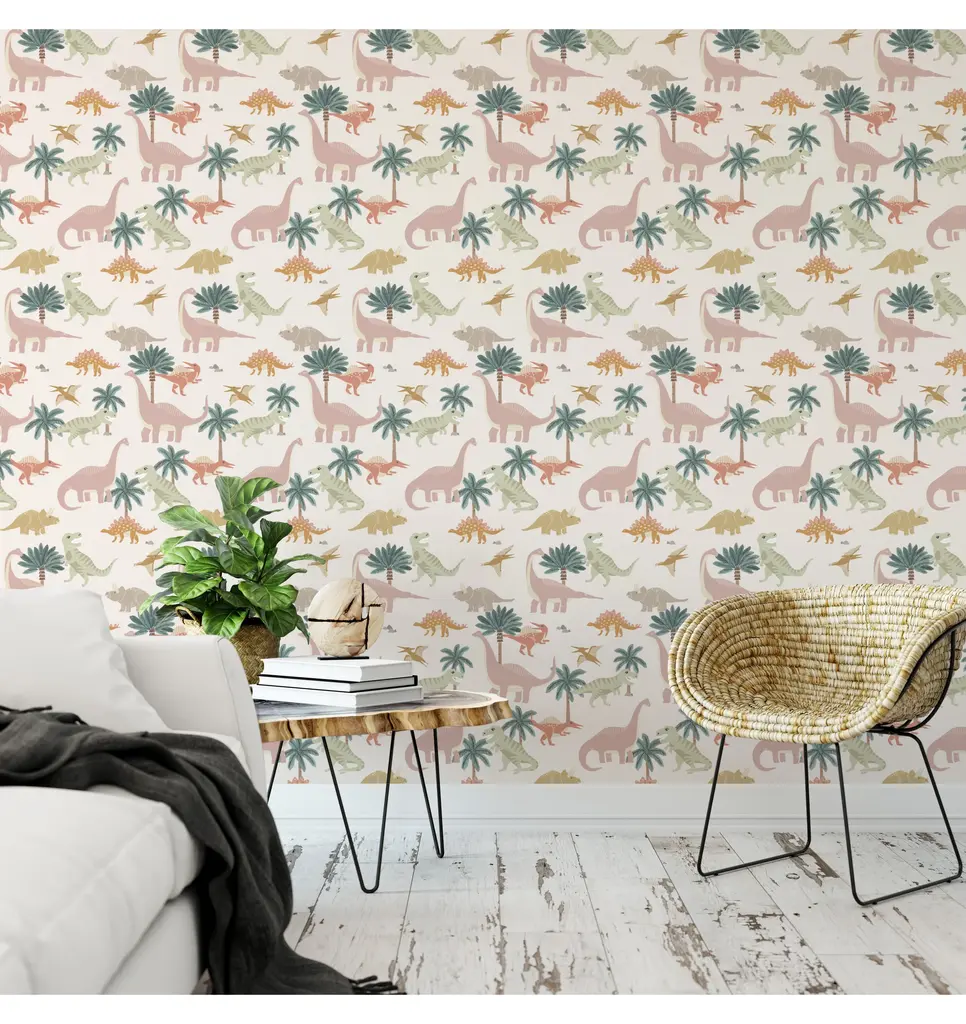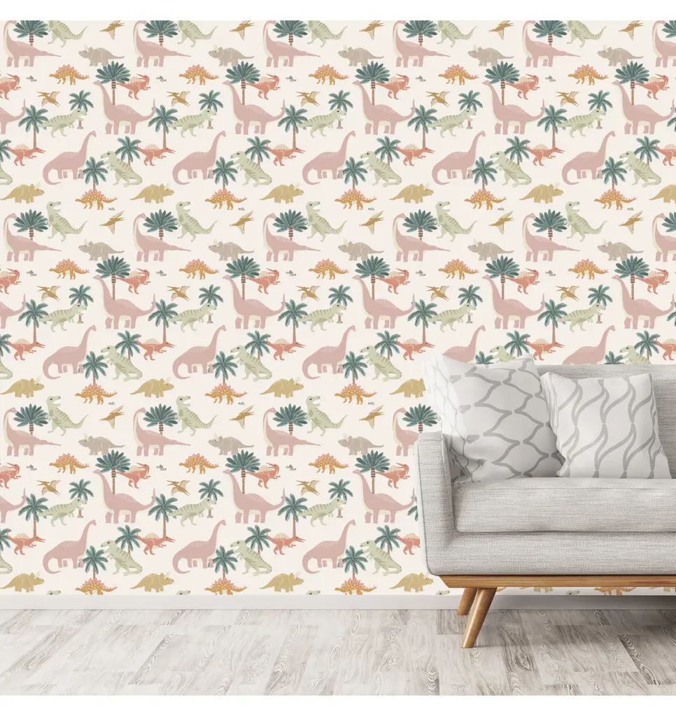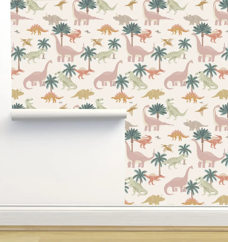 Dinosaurs On Pale Pink Wallpaper By Erin Kendal, 24"x72"