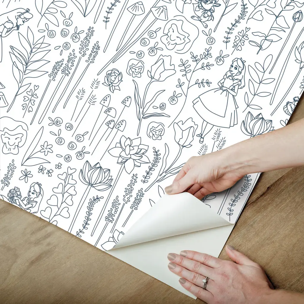 An enchanting woodland linework print featuring Disney''s Alice, the Cheshire Cat, and the White Rabbit venturing through talkative florals and mysterious mushrooms. Perfect for Disney lovers, this botanical peel and stick wallpaper print from RoomMates brings the whimsy of Walt Disney''s Alice in Wonderland to your space in as little as Peel, Stick Done! Disney Alice in Wonderland Navy Garden Peel and Stick Wallpaper comes on one roll that measures 20.5 inches wide by 18 feet long. White and navy peel and stick wallpaper featuring officially-licensed imagery from Disney Alice in Wonderland. Peel and stick to apply, pull up to remove. Disney Enchanted Collection Peel and Stick Wallpaper is safe for walls and leaves no sticky residue behind. Easily repositionable while installing. Disney Enchanted Collection Peel and Stick Wallpaper sticks to any smooth, flat surface - perfect for DIY projects. Ideal for rental or home decorating. Comes on a 20.5-in x 18-ft roll and covers about 30.75 sq. ft. Design repeat of 20.5-in. This product should NOT be applied to textured walls - smooth clean, dry, painted surface only (no Non-Stick paint or soap residue).