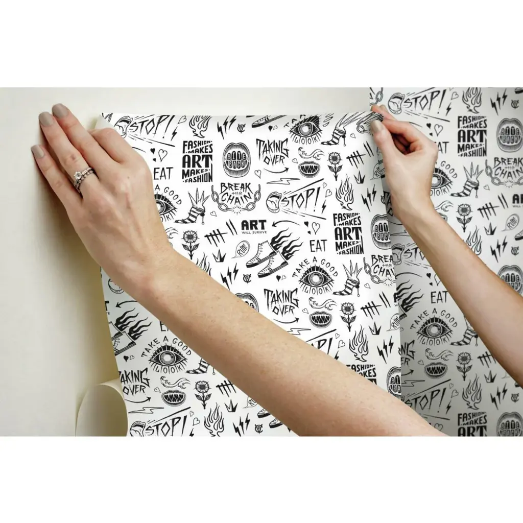 Comes with 1 roll - 18" widex18.86''. Design has a straight match with a 18 inch repeat. Covers 28.29 square''. Edgy, like the designer herself, Disney''s Cruella Graffiti peel and stick wallpaper from RoomMes brings the graphic artistry of the blockbuster movie into your home with this collage of vital, movement oriented motifs.
