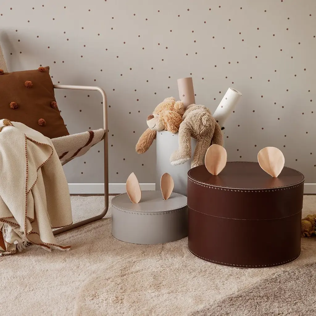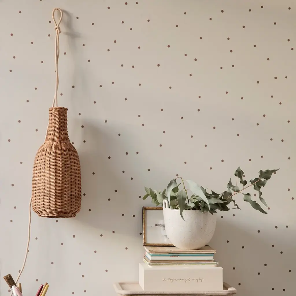 Handprinted polka dot forms reminiscent of potato stamps are printed in random patterns on our Dot wallpaper. Made using waterbased colors on non-woven paper, the subtle, yet statement making design works equally well in a child’s bedroom as it does in a living room. Versioned in off white, dusty rose and pale grey, each is printed with dots in complementary colors.