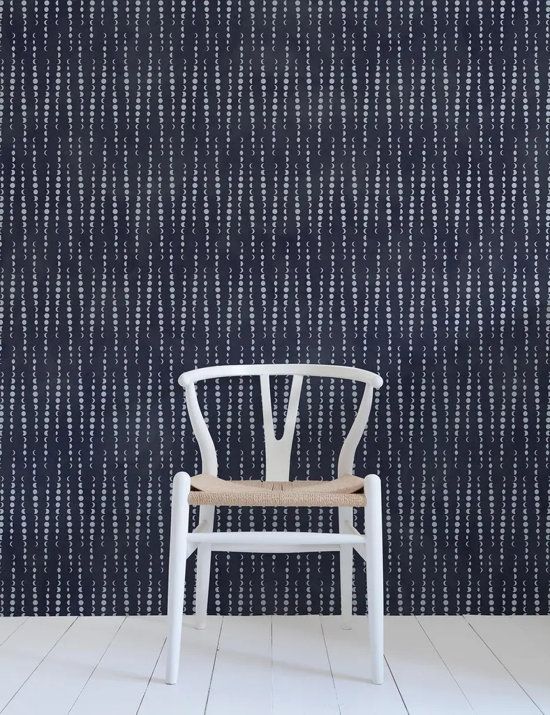 This Ikat-reminiscent pattern balances the moon in its fluctuating forms, reflecting the passing of time as it rises, sets and spins.Samples are available for $18 including US shipping, please message us to purchase.Printing: Digital pigment print (minimum order of 4 rolls). Material: FSC-certified paper. Trimming: This product may come pre-trimmed or untrimmed. Packaging: May be shipped as double rolls, or as a combination of double and single rolls. Single roll: 27 inches × 5 yards (68.8 cm × 4.5 meters) Sample: 8 × 10 inches (20.3 × 25.4 cm) Design repeat: 41.14 inches (104.49 cm)Design match: StraightMade in the USA. Ships worldwide.Commercial grade options available; please contact us for more information.