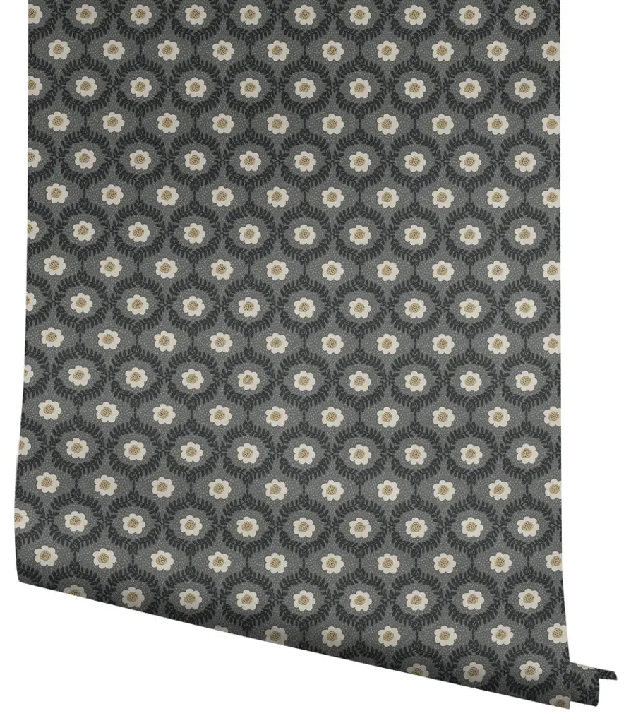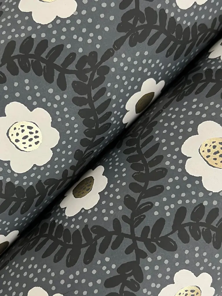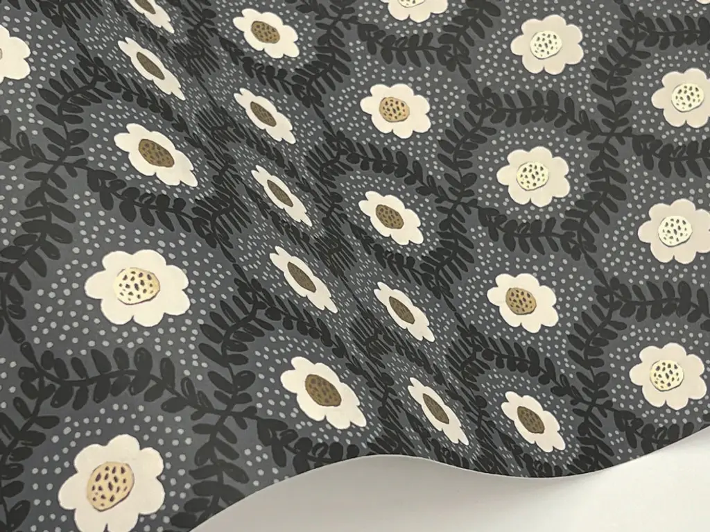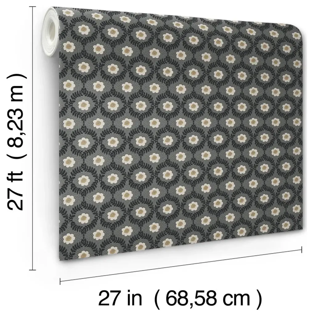 Sweet and playful, this botanical ogee features a central white floral surrounded by a circular, leafy black frame. The charcoal grey background is given extra depth from tiny, silver dots. This Emma Wallpaper measures approximately 27 inches wide by 27 feet long, measuring approximately 60.8 square feet per roll. The world of Rifle Paper Co. is in full bloom with their third wallpaper collection. With statement floral prints, detailed illustrated designs, and metallic accents, this collection is designed to bring beauty to every room. Unpasted non woven material; 25.25-in repeat, straight match; Washable and strippable; 27-in by 27-ft long roll; Covers about 60.8 square feet