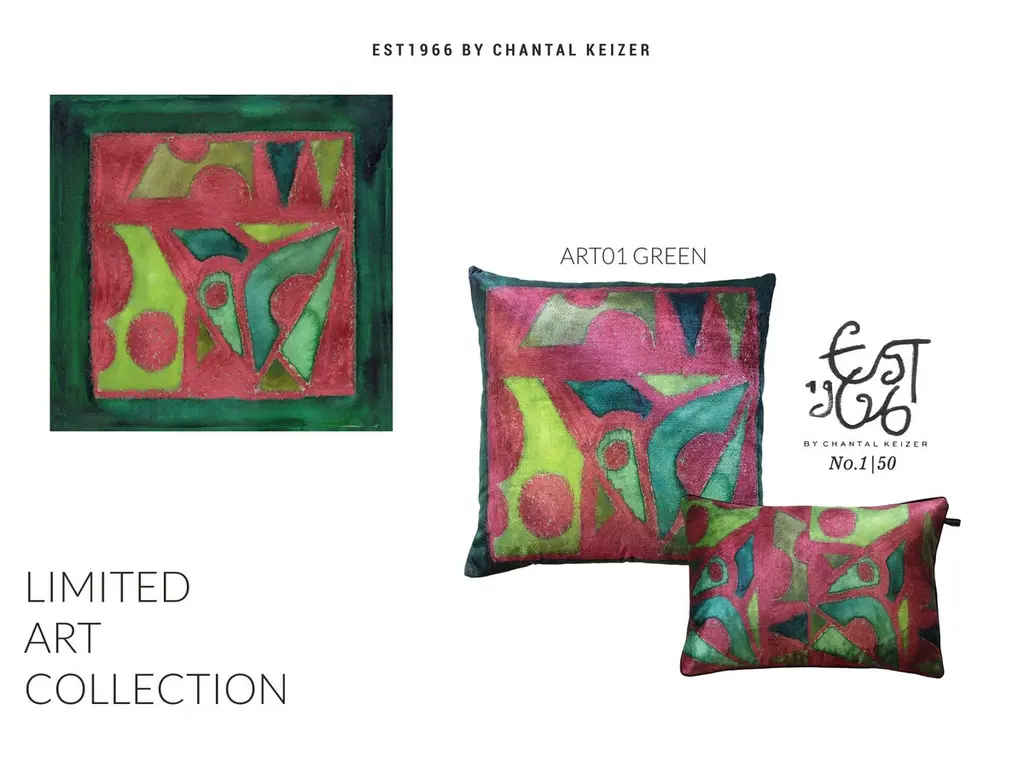 Chantal Keizer painted a number of ART works and transferred them to fabric in a limited collection. Of each work a maximum of 50 cushions are available worldwide.The colours are deep greens and metallics, the backside is ruby red.This design is printed on a very luxurious woven velvet with a beautiful shine. The pillow has a luxurious look and feel and is a high quality product.We send the cushion cover without inner filling. you can purchase a down inner filling on request.Material and size sleeve : 100% polyster in 50-50 cm.Chantal Keizer is an experienced designer in the field of interior textiles and wallpapers. She lives in Amsterdam in the Netherlands.EST1966 by CHANTAL KEIZER is her interior brand. She offers several collections. The Botanic collection with plants found all over the world which she uses for her design. The hand-painted collection. The found Birth feather collection.