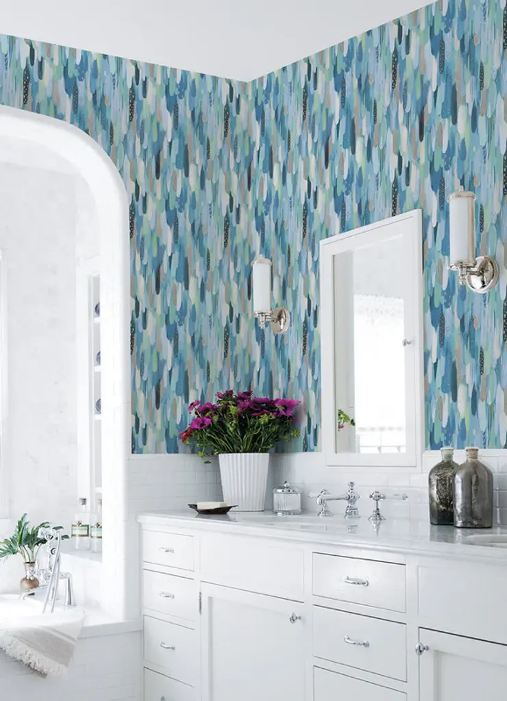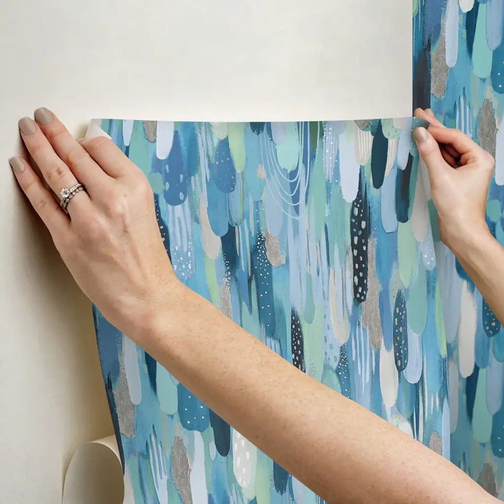 This painterly print by EttaVee is the perfect way to add a whimsical element into any space with ease! Featuring blue and green brushstrokes arranged in a scale-like pattern, this peel and stick wallpaper installs in as little as Peel, Stick�Done!� Blue & Green Brushstroke Peel and Stick Wallpaper comes on one roll that measures 20.5 inches wide by 18 feet long. Blue brushstroke peel and stick wallpaper designed by EttaVee. ; Peel and stick to apply, pull up to remove; EttaVee x RoomMates is safe for walls and leaves no sticky residue behind; Easily repositionable while installing; EttaVee x RoomMates sticks to any smooth, flat surface - perfect for DIY projects; Ideal for rental or home decorating; Comes on a 20.5-in x 18-ft roll and covers about 30.75 sq. ft; Design repeat of 20.5-in.