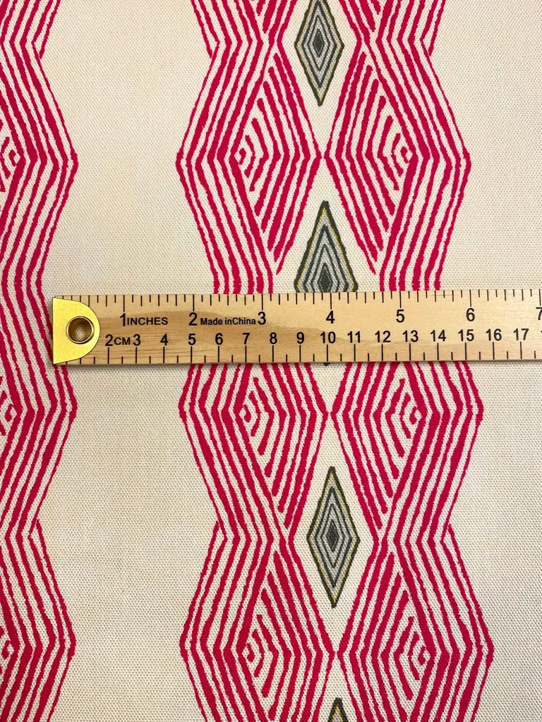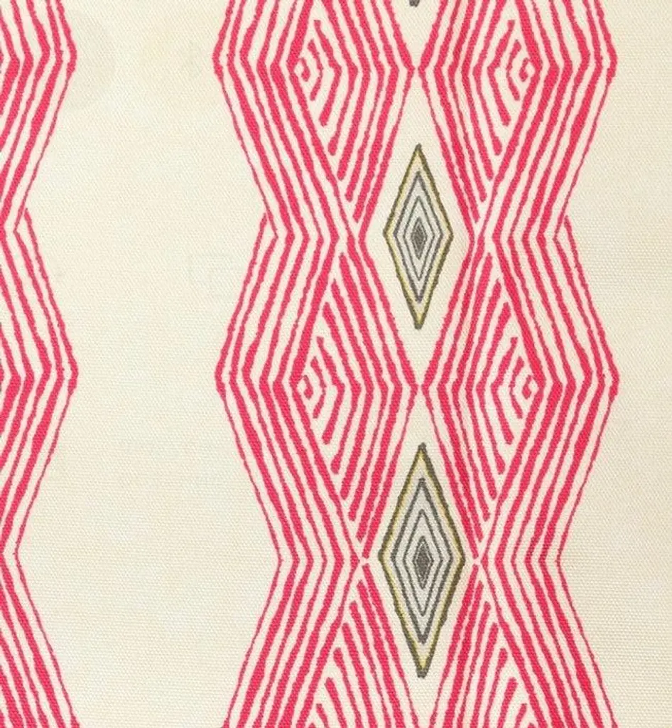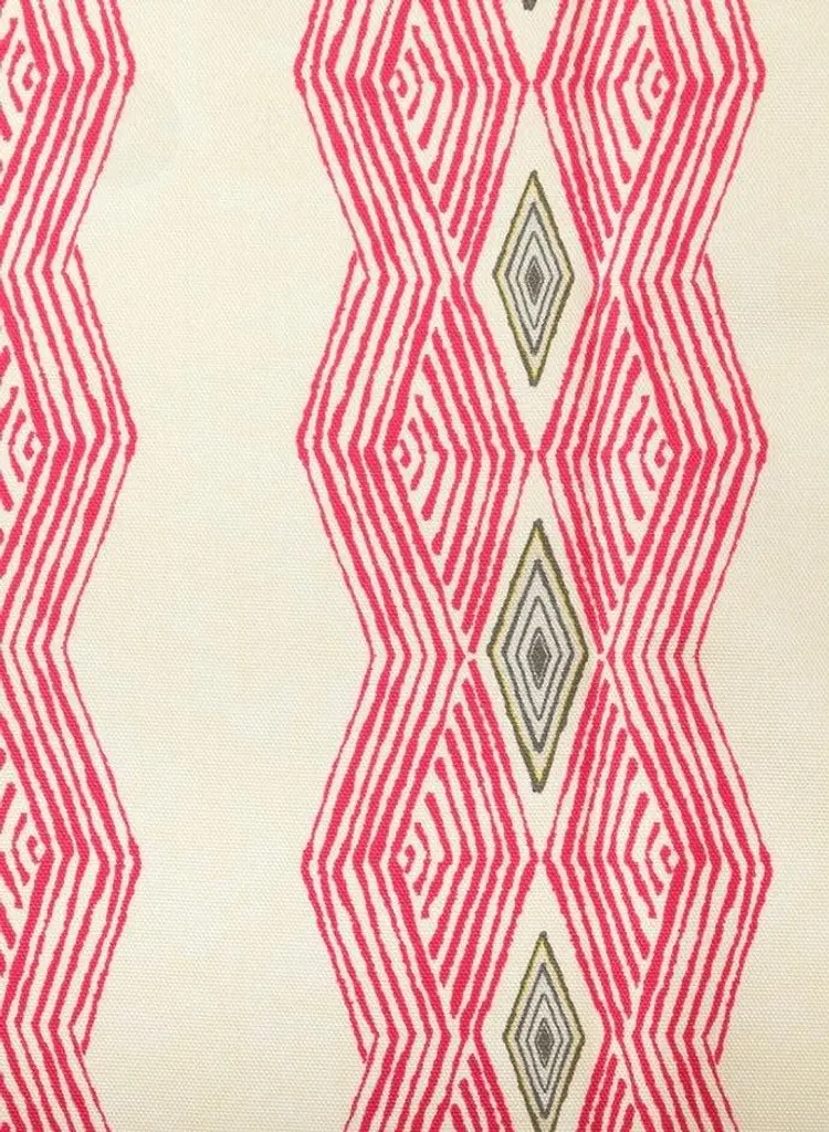 60” wide Eva Sonaike Odi fabric pink geometric indoor outdoor upholstery fabric in cream, fuchsia, yellow and black. Price is per yard. V: 18cm x H: 14.9cm 100% cotton (Half Panama & Twill), 100% Polyester (Outdoor Twill, Crib 5) • Usage - Upholstery and drapery • Made to complement our wallpaper, cushions and furnishings • Dry clean recommended • Rub test - 40,000 (Half Panama Cotton), 50,000 Outdoor Twill