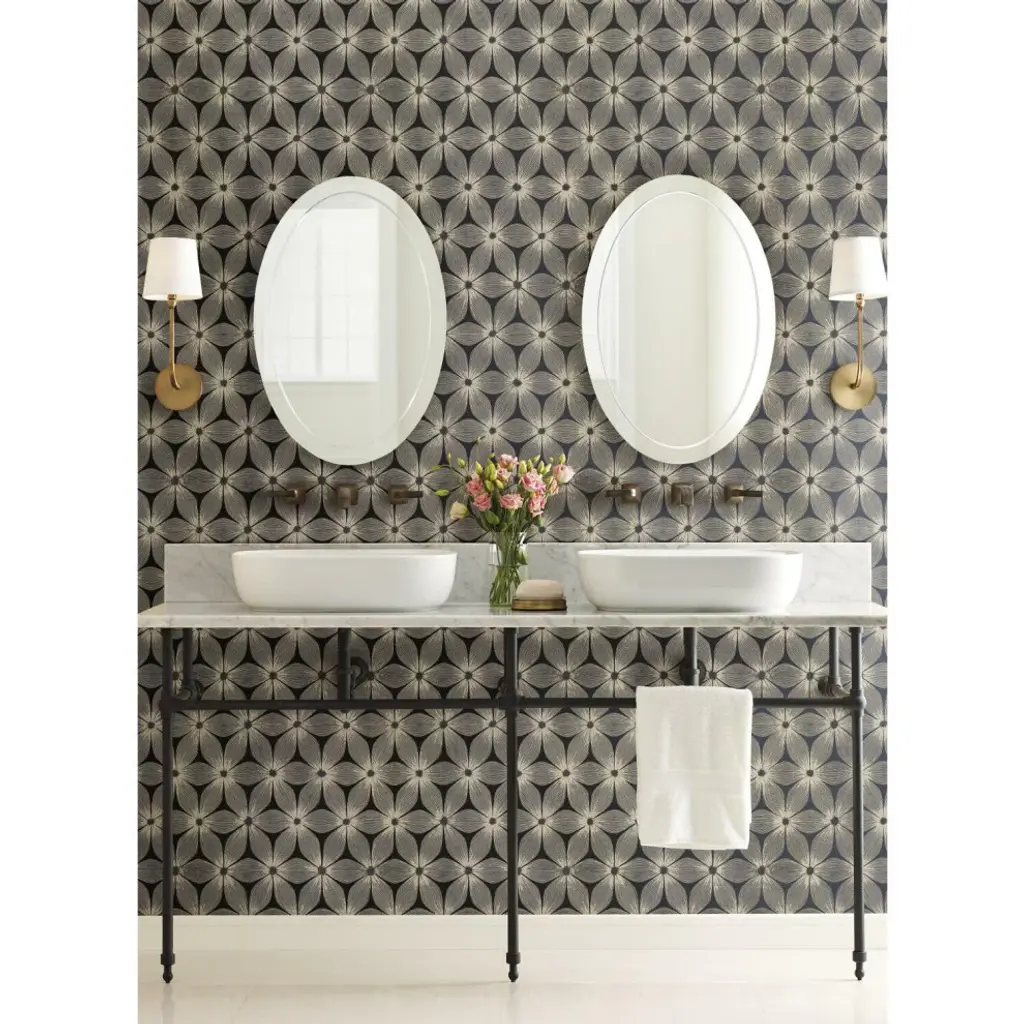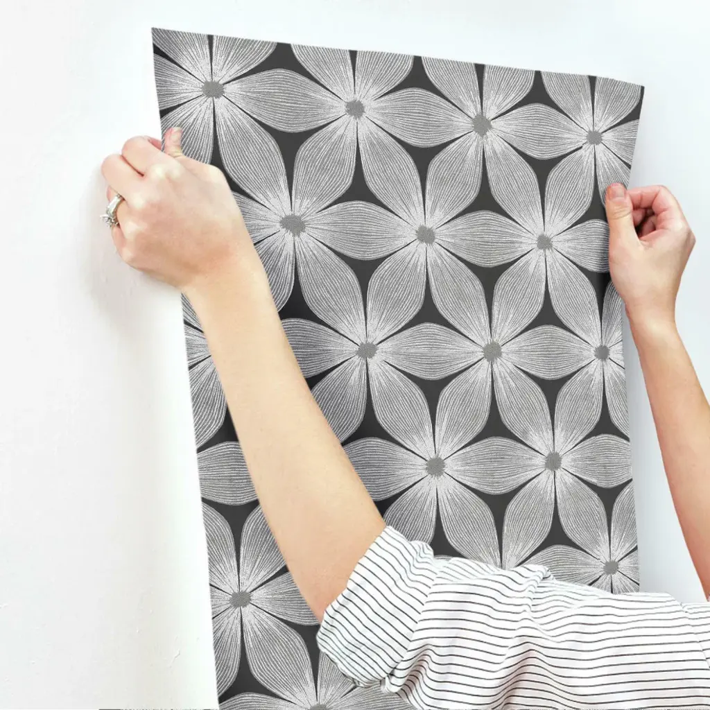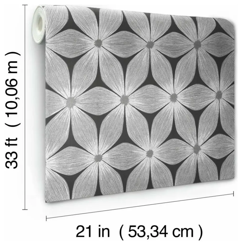 Oversized blossoms, like wildflowers, form an interlocking design against a solid background. The daisy-like blooms have a glistening finish thanks to the metallic inks on Everlasting Wallpaper. This Everlasting Wallpaper measures approximately 21 inches wide by 33 feet long, covering About 57.8 square feet per roll. Durable and easy to remove from primed walls, this friendly to hang unpasted nonwoven wallpaper is created with a special blend of synthetic fibers, making it both easy to hang and tear resistant. Unpasted non woven material; 21-in repeat, straight match; Washable and strippable; 21-in by 33-ft long roll; Covers about 57.8 square feet