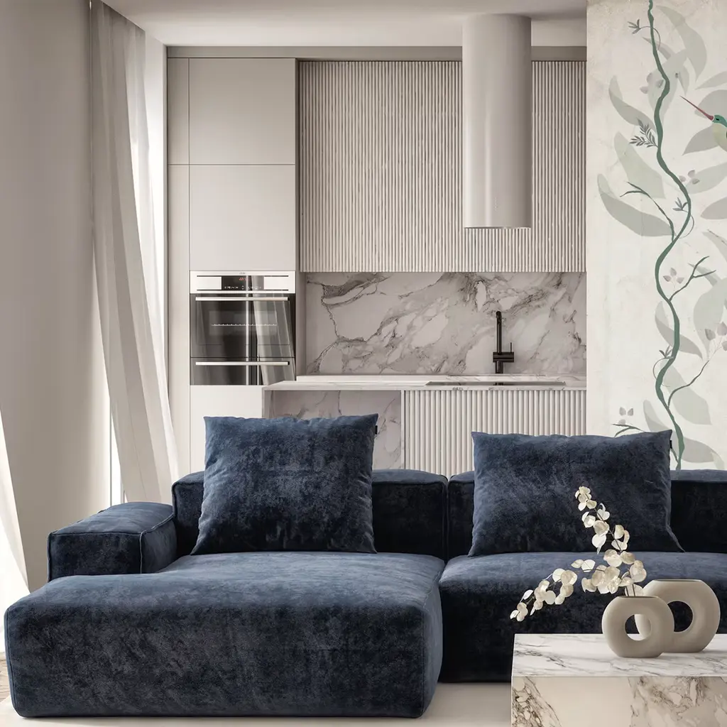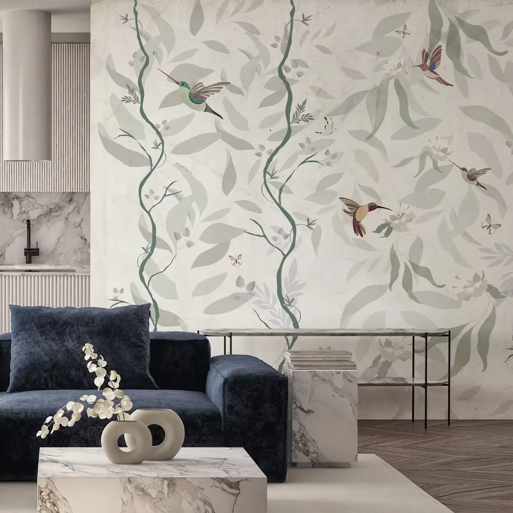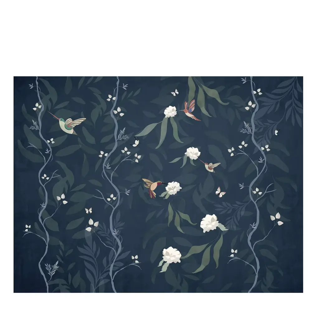 Dreamy and delicate, this charming wallpaper depicts a fairytale-like scene of colorful birds cheerfully picking from white flowers, in a sinuous and dynamic ensemble of leaves, petals, and branches. Effortlessly adorning any wall of a modern interior, it is fireproof, unscented, breathable, and hypoallergenic. Made of cellulose, textile fibers, and vinyl, it is also available in fiberglass or ECO variants upon requests to the Concierge. The price is per squared meter.