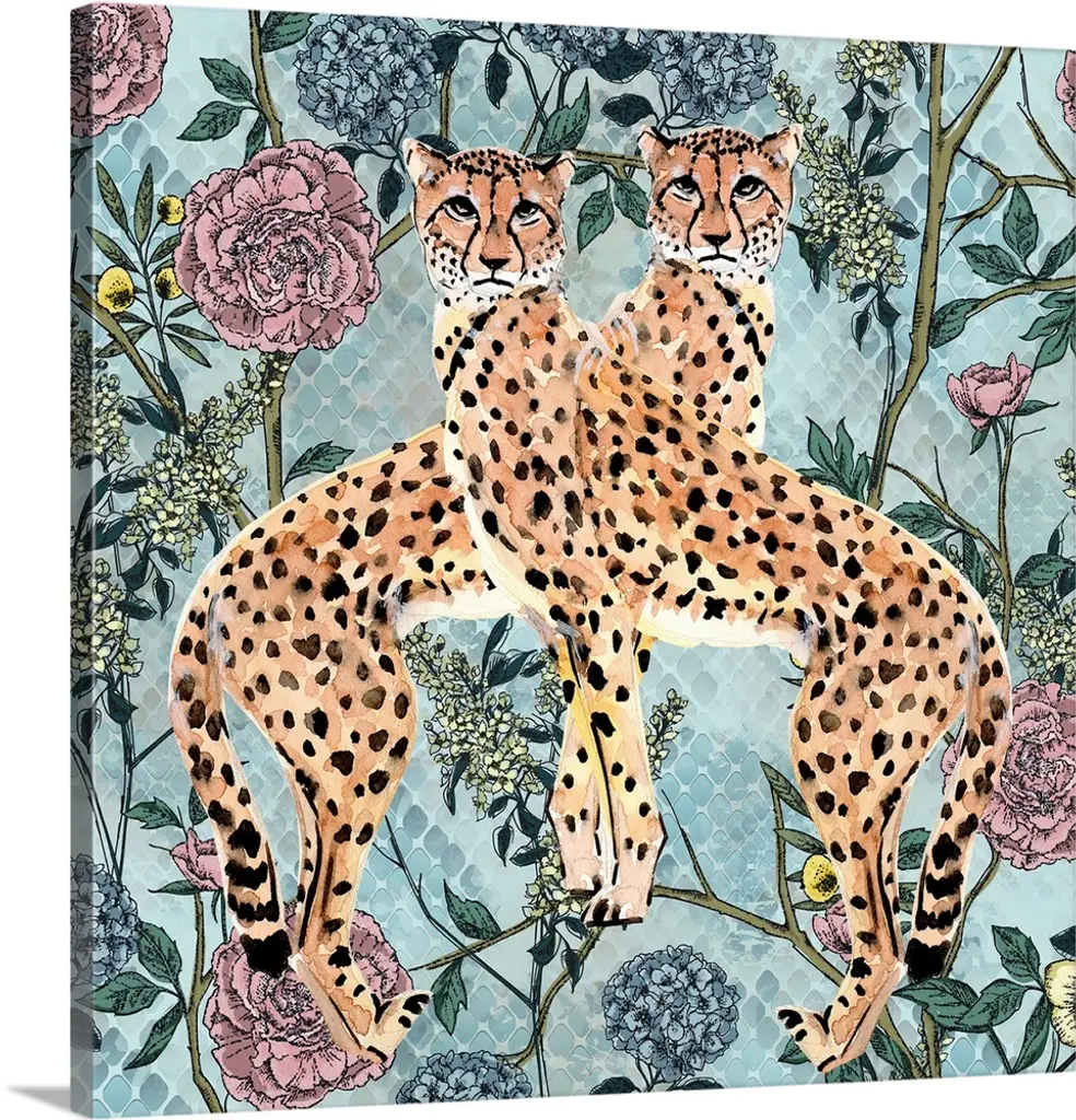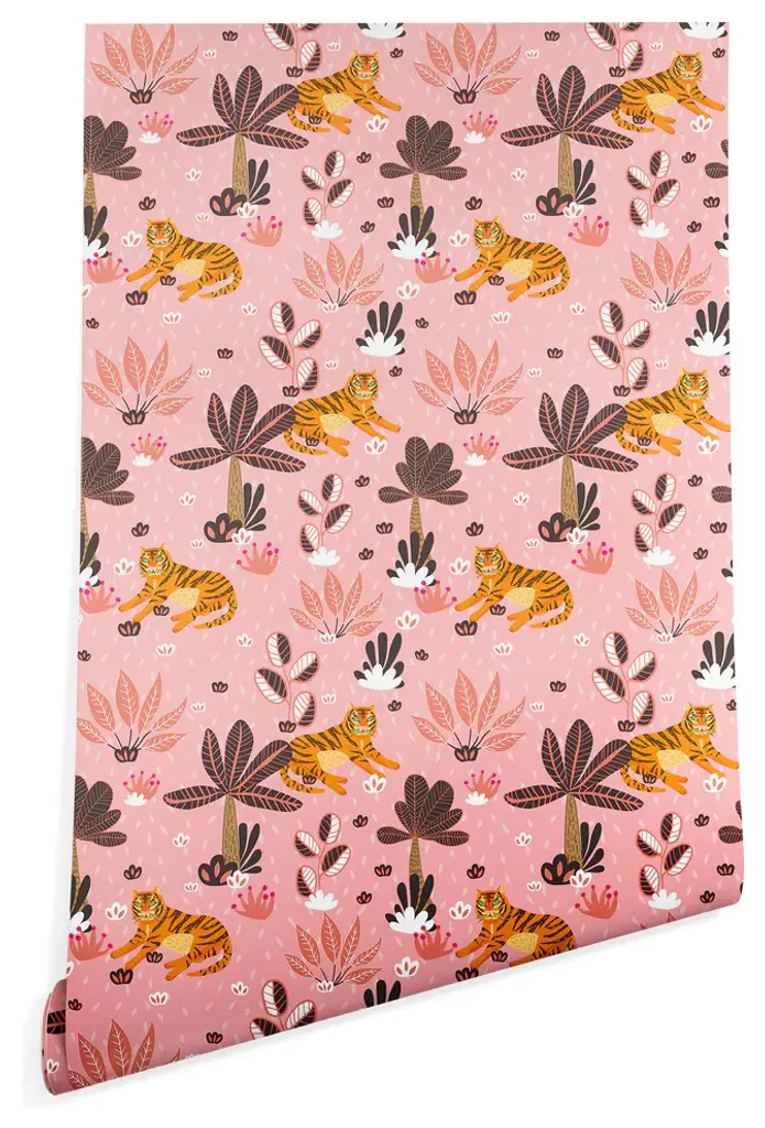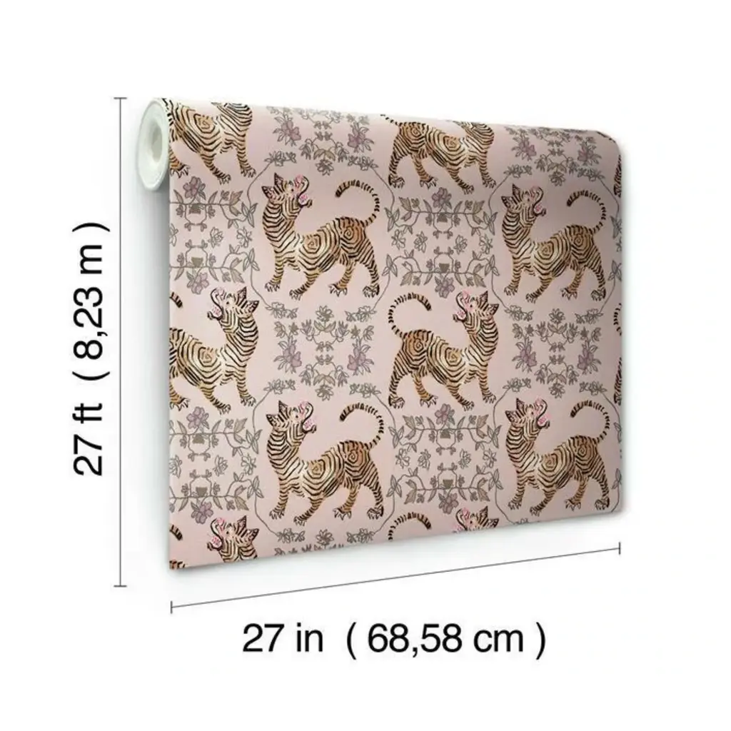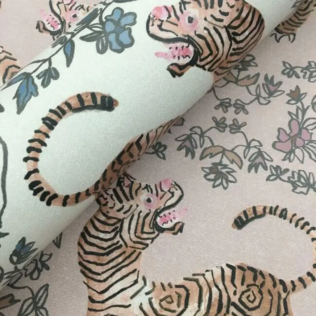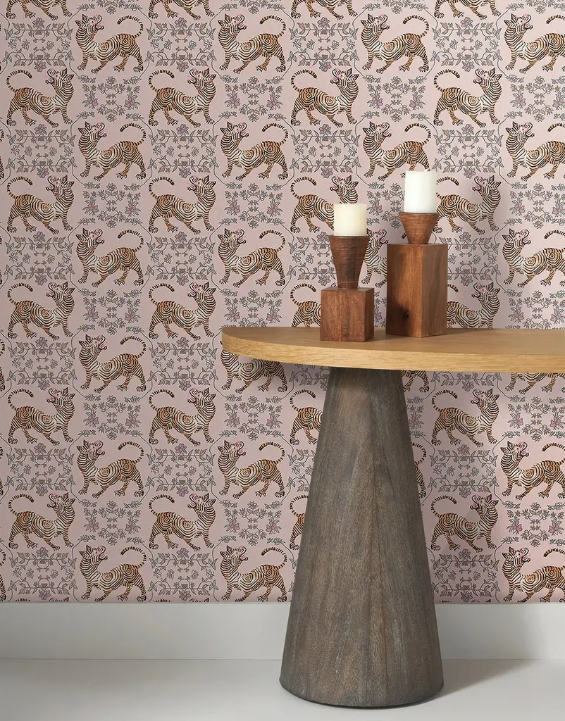 The Ferrandi wallpaper is inspired by the gorgeous rugs and textile fragments of Tibet. Reinterpreted through a modern lens and hand-painted by our artisans, a fierce ambush of Tibetan Tigers prowl through an artisanal landscape strewn with wildflowers.
