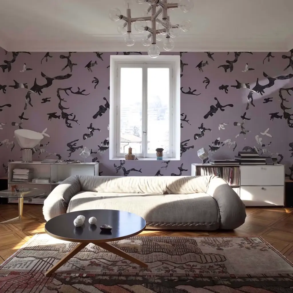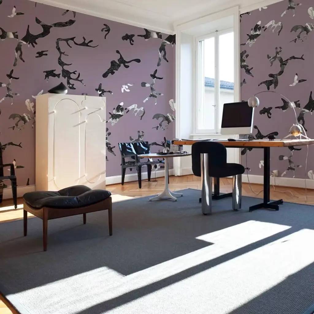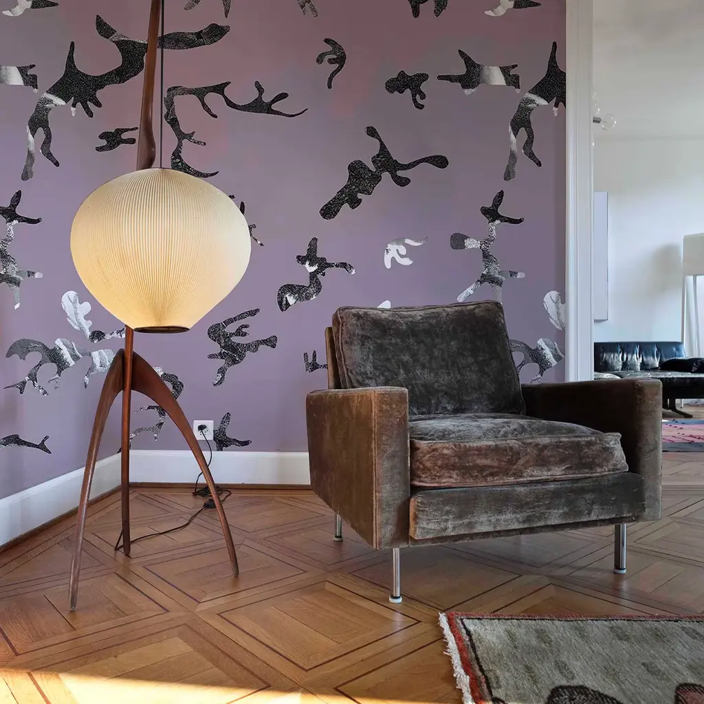 Find Me In The Dark is a patterned wallpaper that seamlessly blends the worlds of camouflage and engravings. This wallpaper masterfully juxtaposes the camouflage pattern with intricately detailed engravings, creating a visually striking and thought-provoking composition. Collection: Tales Part of Space Miscellanea by MaVoix, artist: Magnus Gjoen. Printed on fine art. It is an eco-friendly support made out of cellulose that keeps a very high qualitative perception. Price is per square meter.