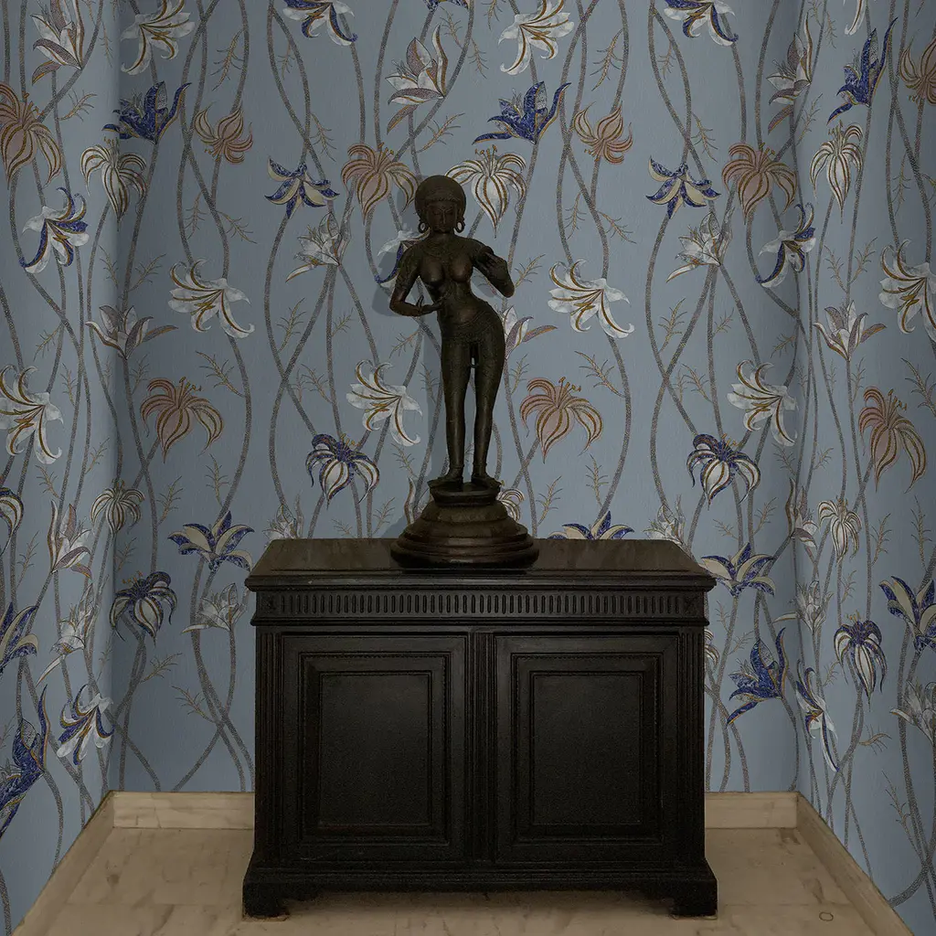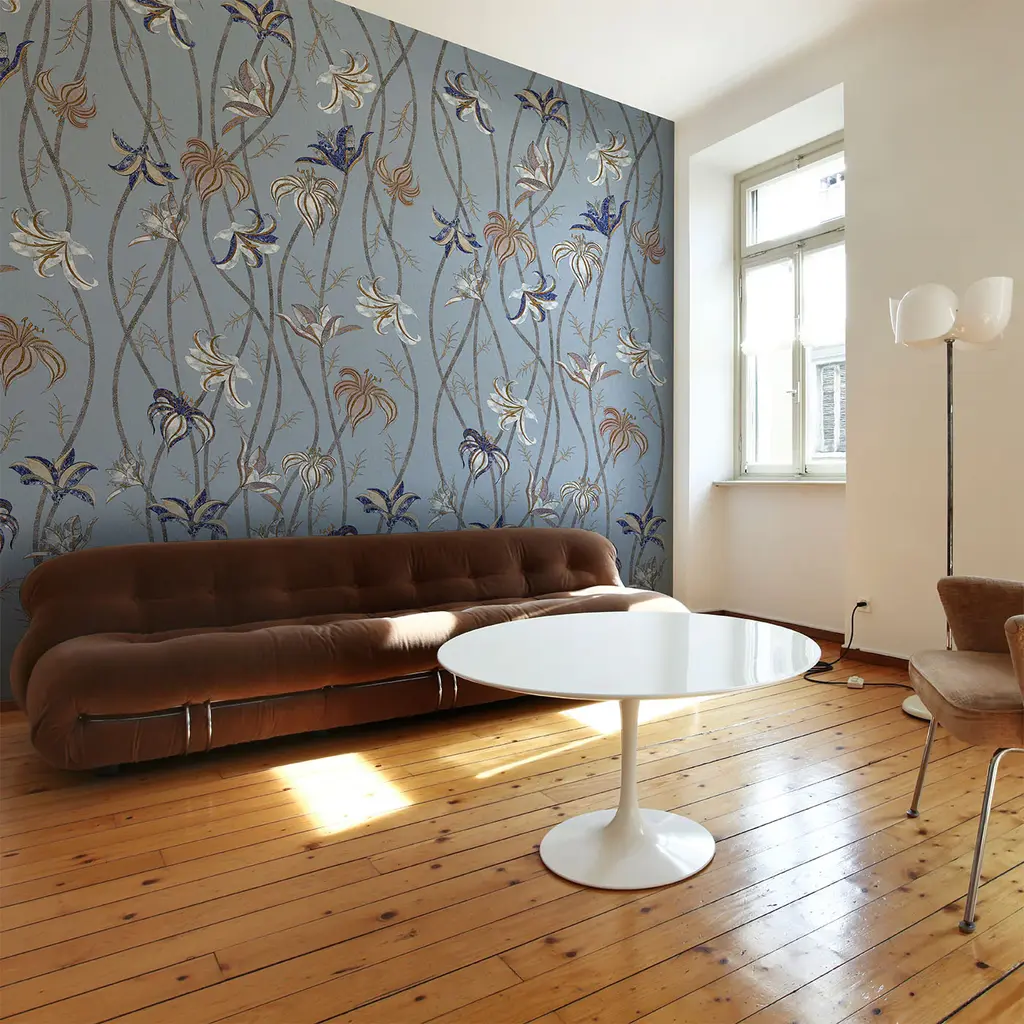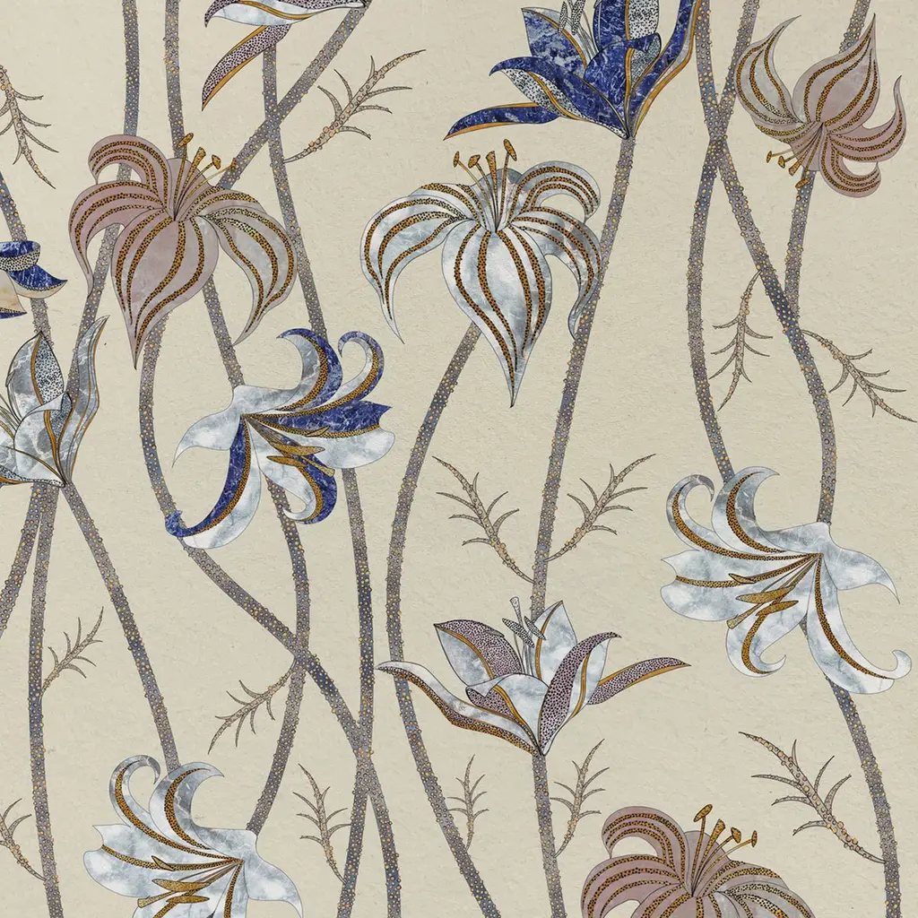 Fine and very long stems run along the whole wall, to end as super-light flowers of Lilium Lancifolium, best known as Tiger Lily. After a careful look at these flowers' designs, it is possible to catch sight of colors and textures that are part of another reality: the ancient technique named Scagliola, the Art of Moonrock. The wallpaper Fiori is freely inspired by this very ancient art, which consisted of the skillful workmanship of plaster. This was then used to replace more precious materials.