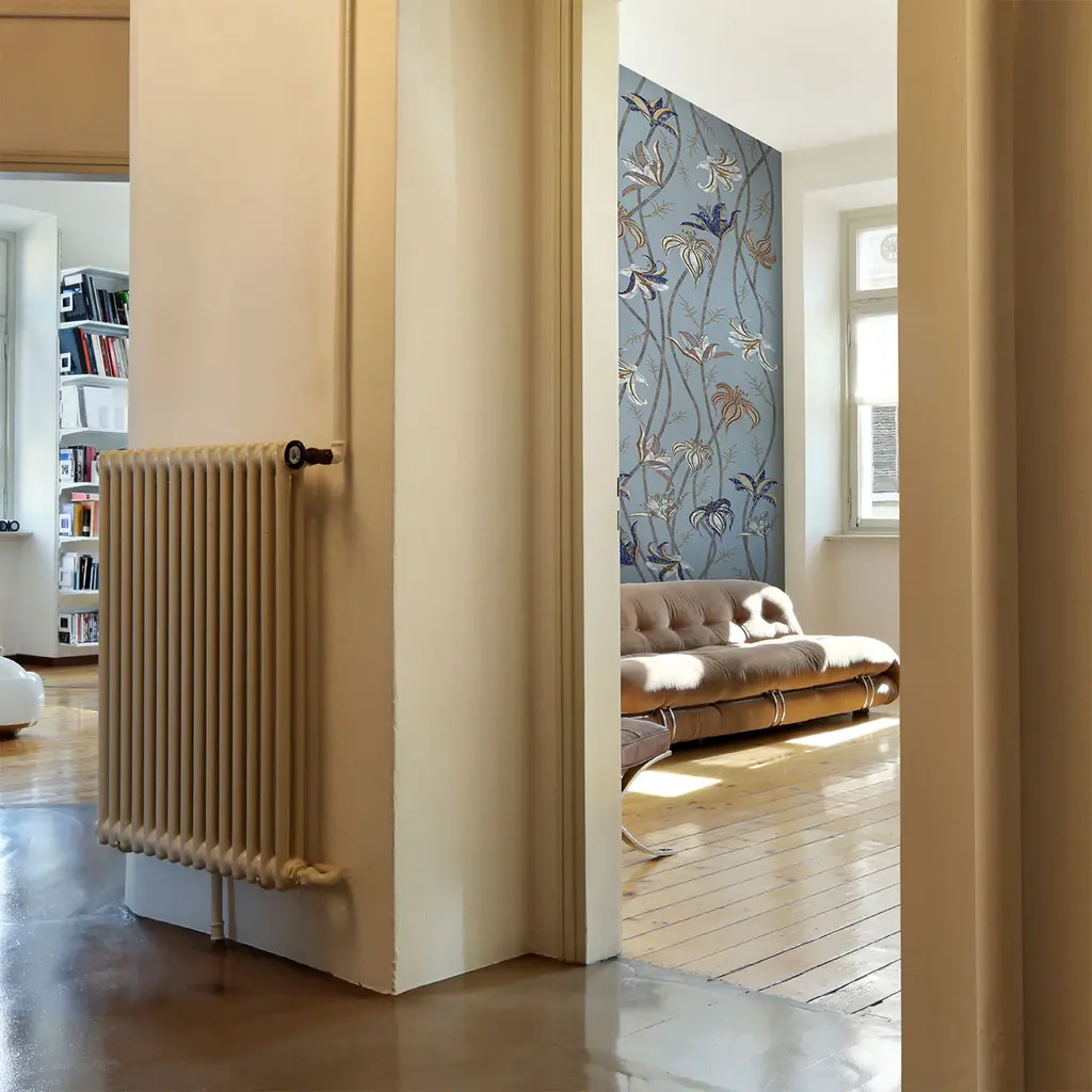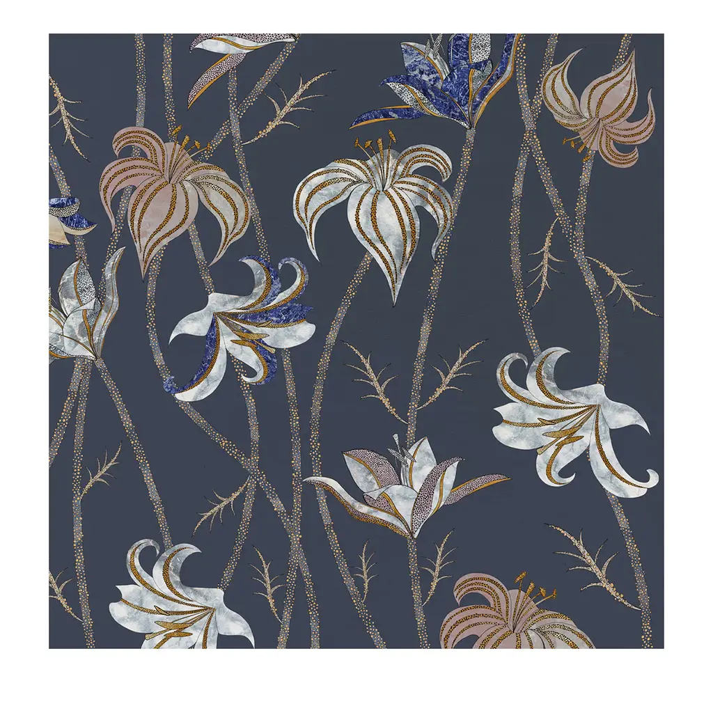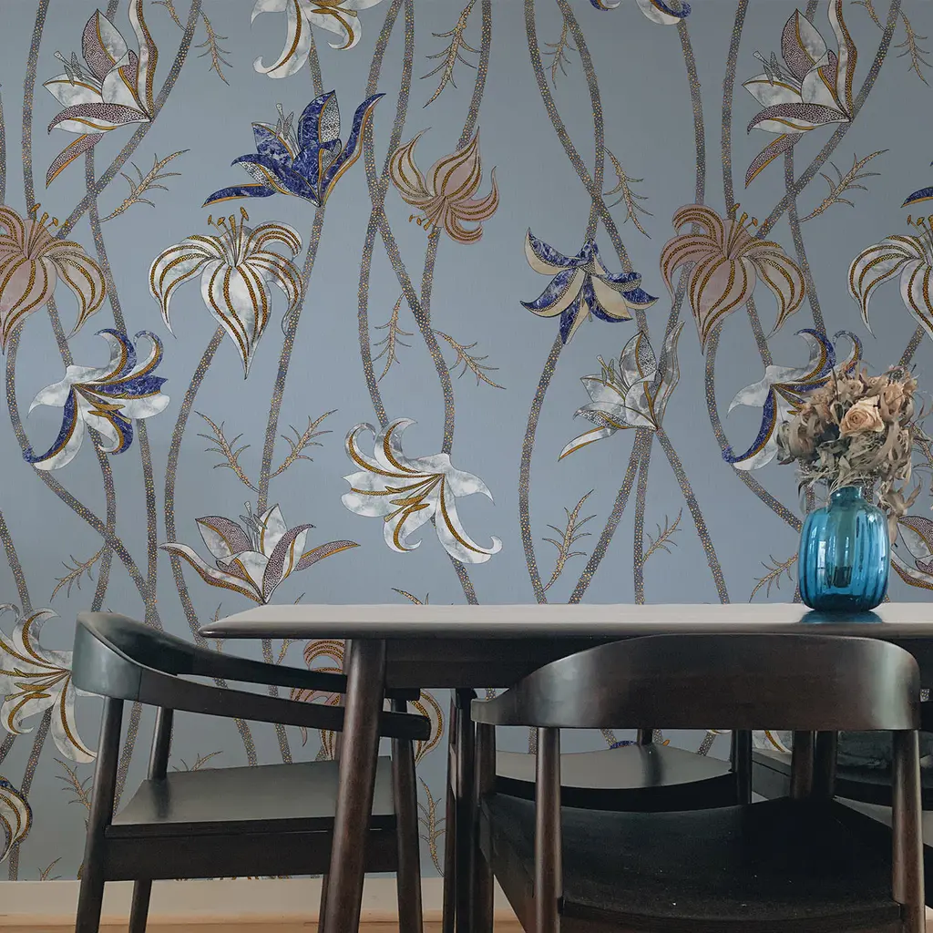 Fine and very long stems run along the whole wall, to end as super-light flowers of Lilium Lancifolium, best known as Tiger Lily. After a careful look at these flowers' designs, it is possible to catch sight of colors and textures that are part of another reality: the ancient technique named Scagliola, the Art of Moonrock. The wallpaper Fiori is freely inspired by this very ancient art, which consisted of the skillful workmanship of plaster. This was then used to replace more precious materials.