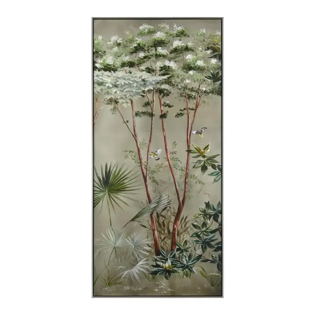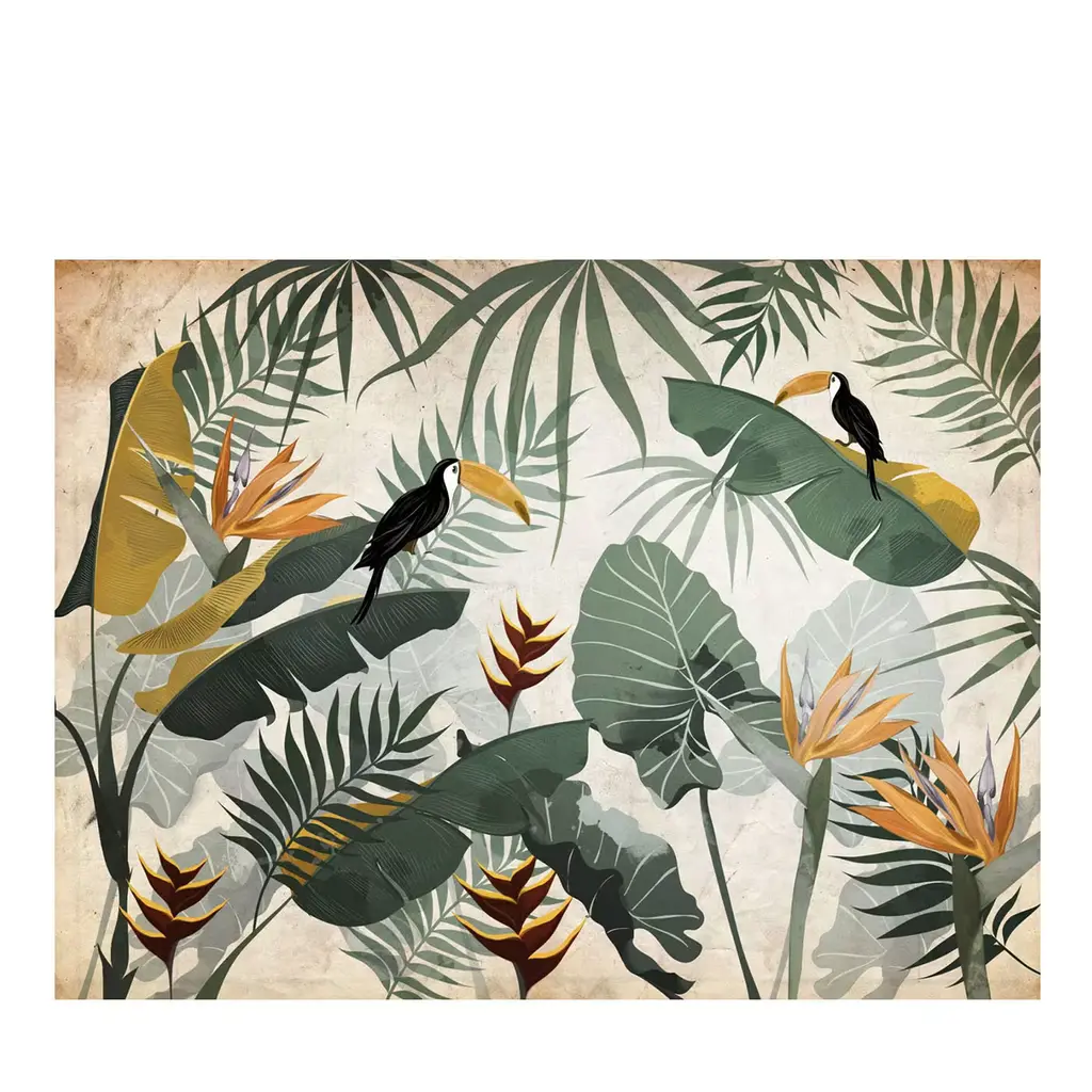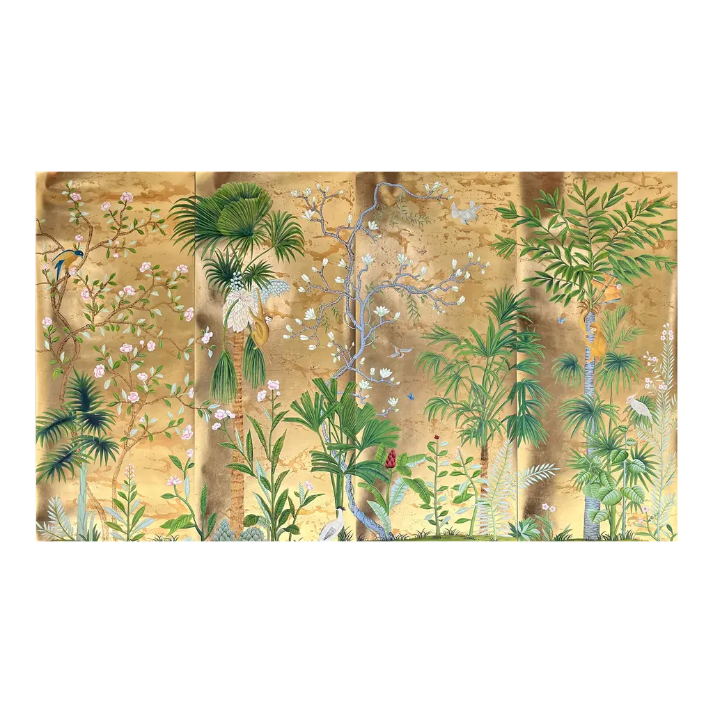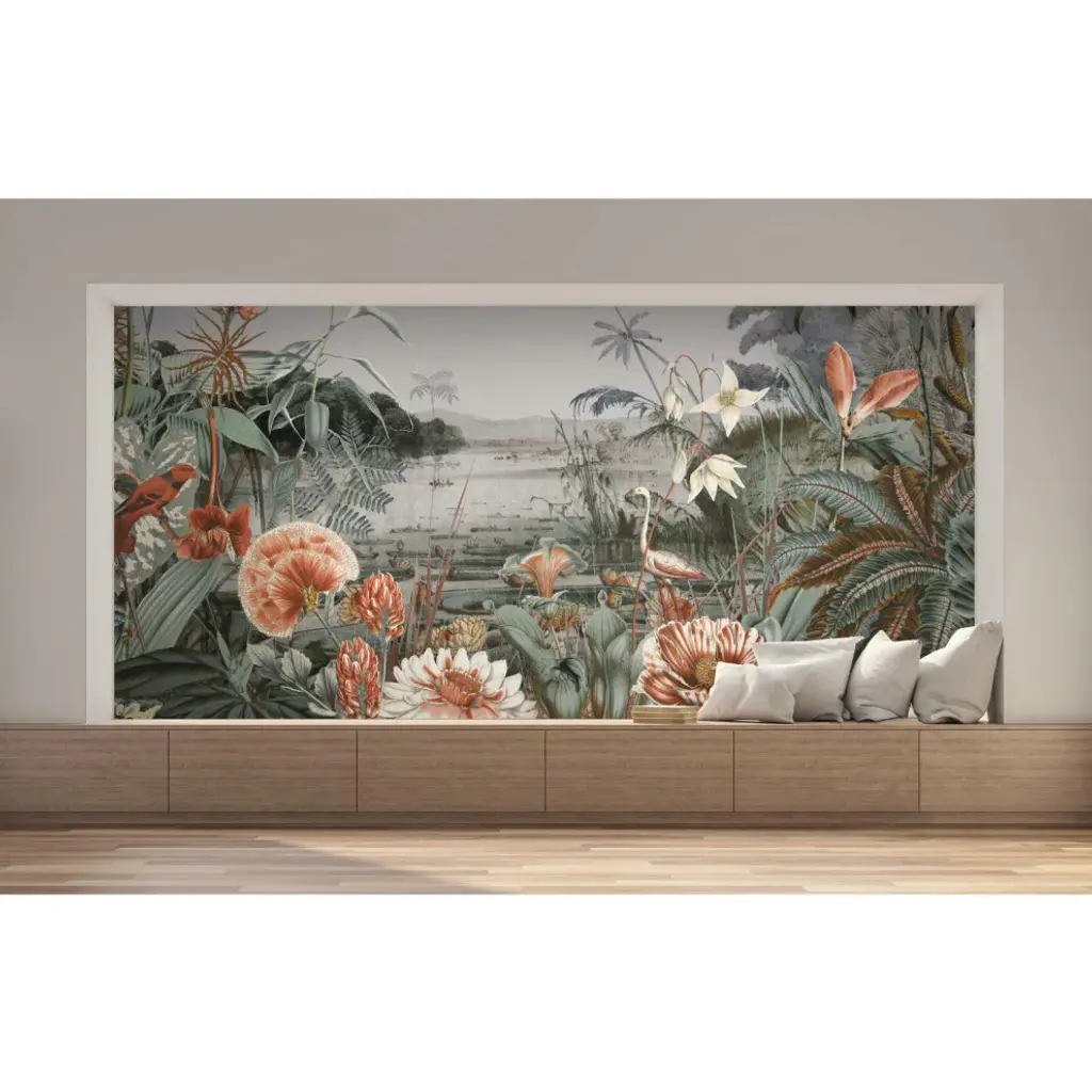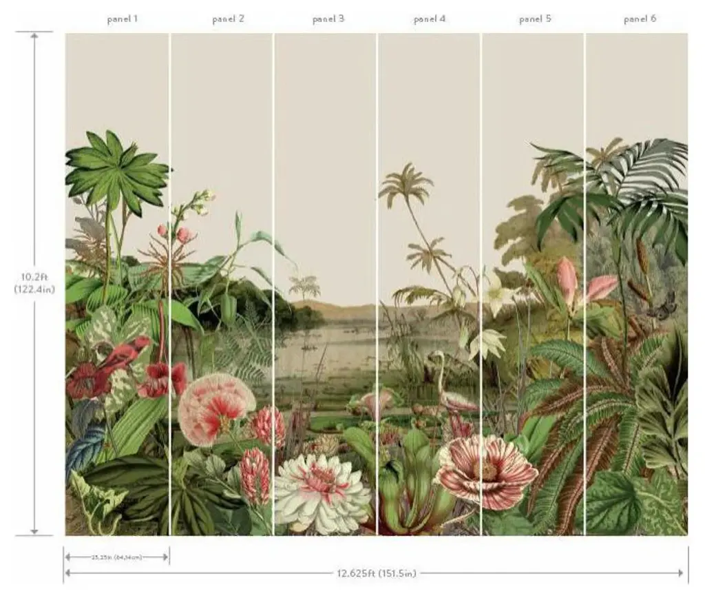 Wallpaper murals�make storytelling and self-expression an artistic work of vibrant color and character. Durable and easy to remove from primed walls, this friendly to hang unpasted nonwoven wallpaper is created with a special blend of synthetic fibers, making it both easy to hang and tear resistant. Asian wetlands inspire the botanical landscape of marshes and tropical foliage in Floating Gardens Mural. Includes 1 mural - 151.5 in x 122.4 in = 128.78 ft sq with a straight match.