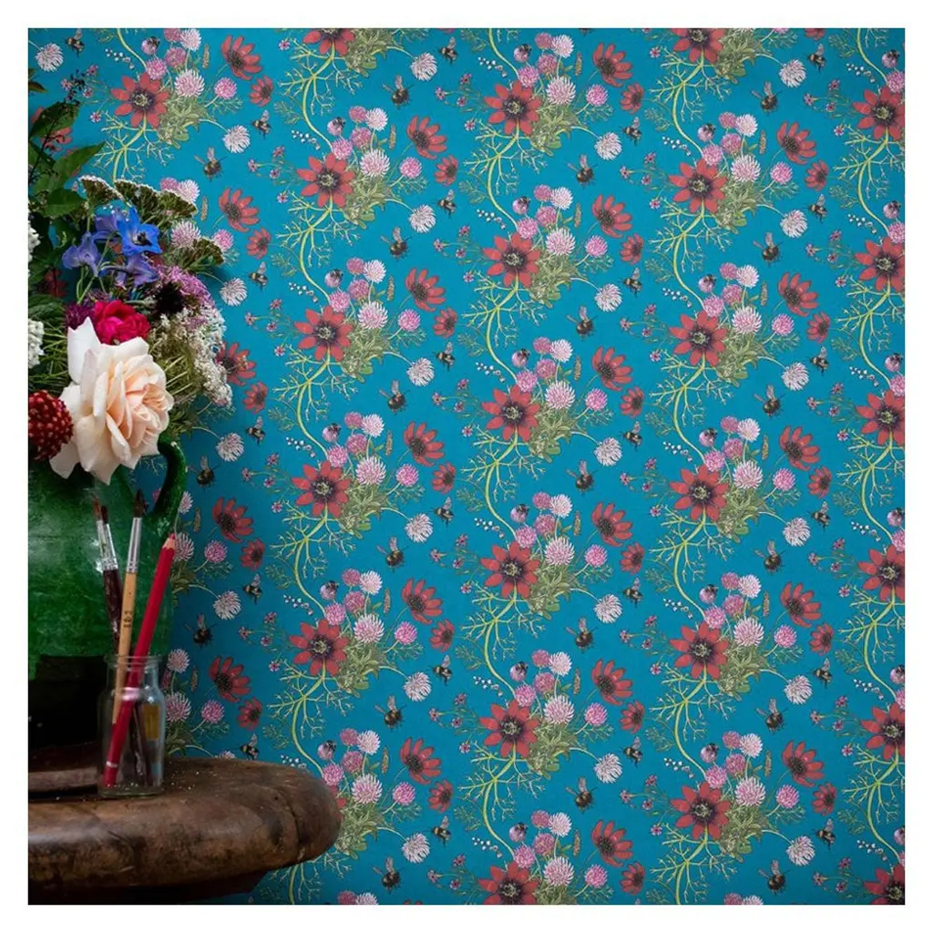 A soothing color palette meets an energizing, abstract design in this modern wallpaper. Floral medallions with impressionistic flair are printed in a soothing combo of sky blue and white, with grey botanical accents throughout. Divine is an unpasted, non woven wallpaper measuring 20.5 inches wide by 33 feet long, covering approxiamately About 56.4 square feet square feet per roll