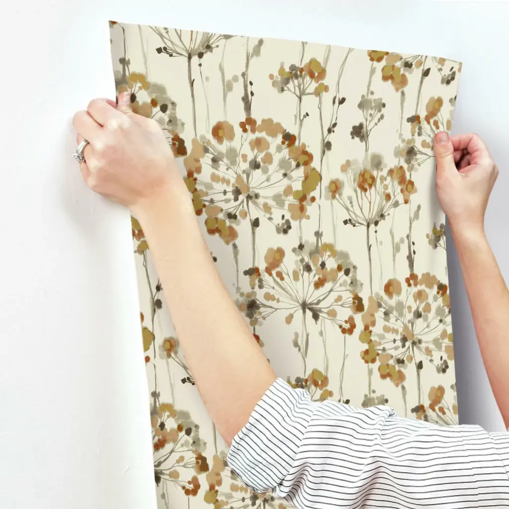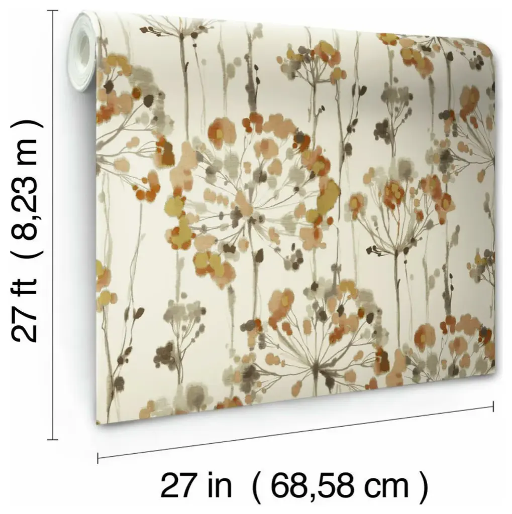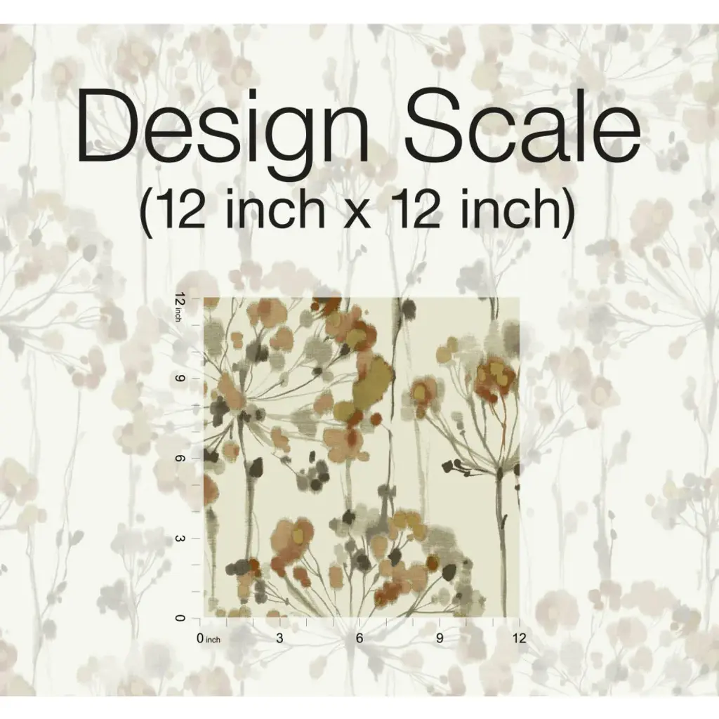 This Flourish Wallpaper measures approximately 27 inches wide by 27 feet long, covering About 60.8 square feet per roll. Unpasted heavy weight paper material; 24-in repeat, straight match; Washable and peelable; 27-in by 27-ft long roll; Covers about 60.8 square feet