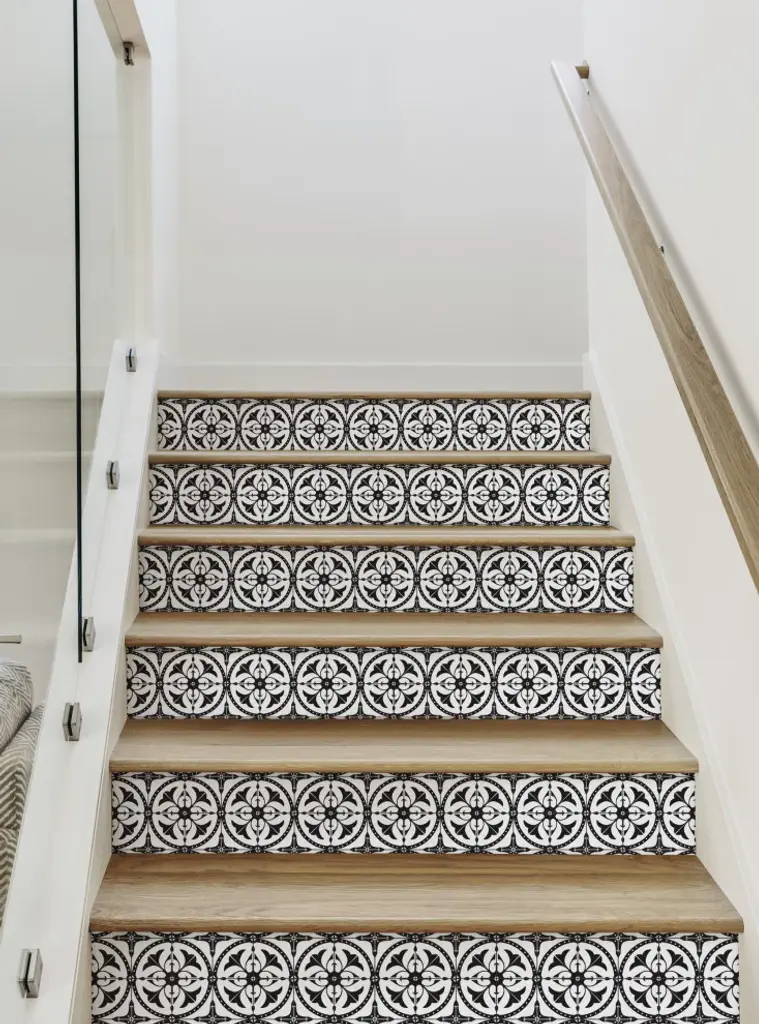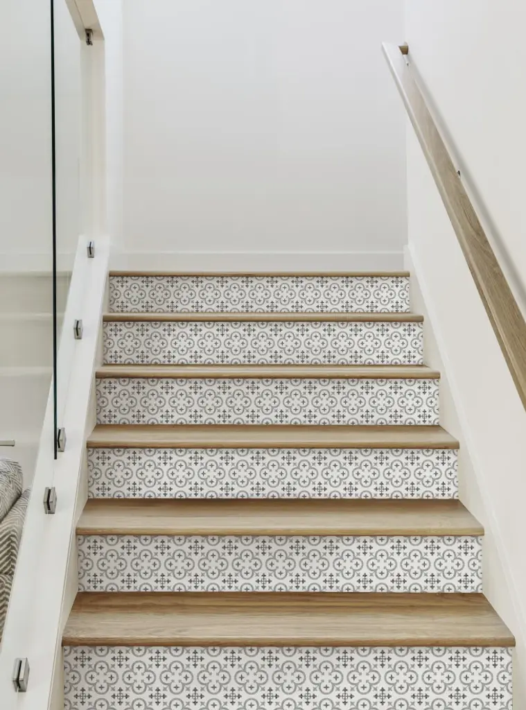 Flower Moroccan Tile Peel And Stick Stair Riser Strips, Grey, 48"w X 6"h, 6 Pack
