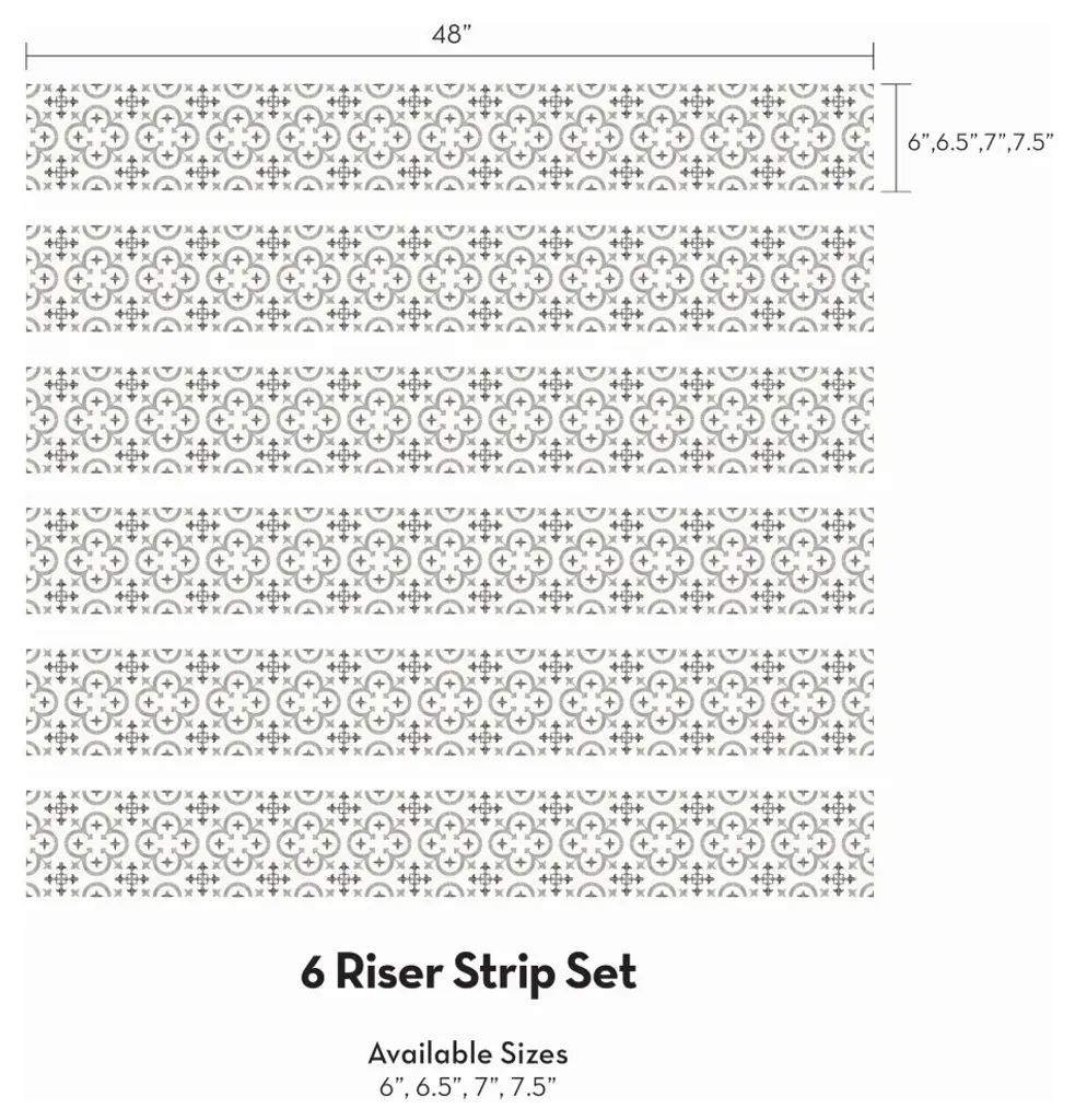 Flower Moroccan Tile Stair Riser Strips let you easily transform your plain looking steps into a luxurious Moroccan styled staircase. DIY decorating has never been easier with this repositionable vinyl that can be easily applied and removed without any stress or mess!This re-positionable wallpaper is designed and made in our studios in New Jersey. The designs are printed onto an adhesive-backed vinyl that can be removed, repositioned, and reused. The wallpaper does not leave residue on your walls and is ideal for DIY room makeovers without the mess and headaches of traditional wallpaper.Size:48"w x 6"h48"w x 6.5"h48"w x 7"h48"w x 7.5"hWhat''s Included1 sheet of peel-n-stick vinyl stair riser strip