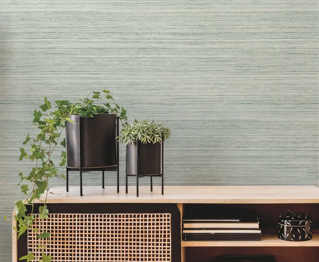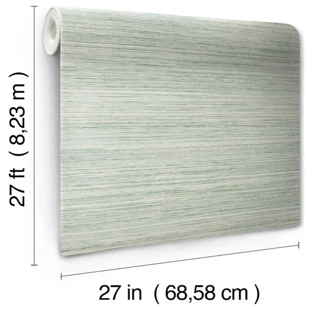 A blend of teal, blue, green, beige and grey hues replicate the woven detailing of grasscloth, slightly embellished with raised inks to add an air of authenticity to Fountain Grass. This Fountain Grass Wallpaper measures approximately 27 inches wide by 27 feet long, measuring approximately 60.8 square feet per roll. Artistic experimentation with the interplay of form, color and texture has led to an avant-garde reimagining of familiar design motifs. Prepasted sure strip material; 24-in repeat, straight match; Washable and strippable; 27-in by 27-ft long roll; Covers about 60.8 square feet