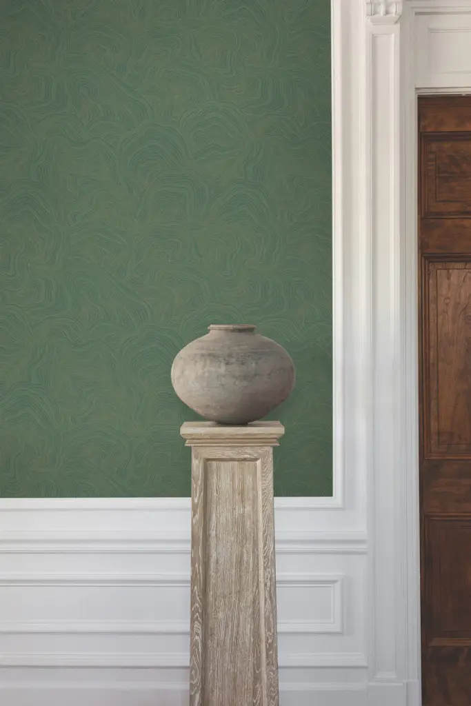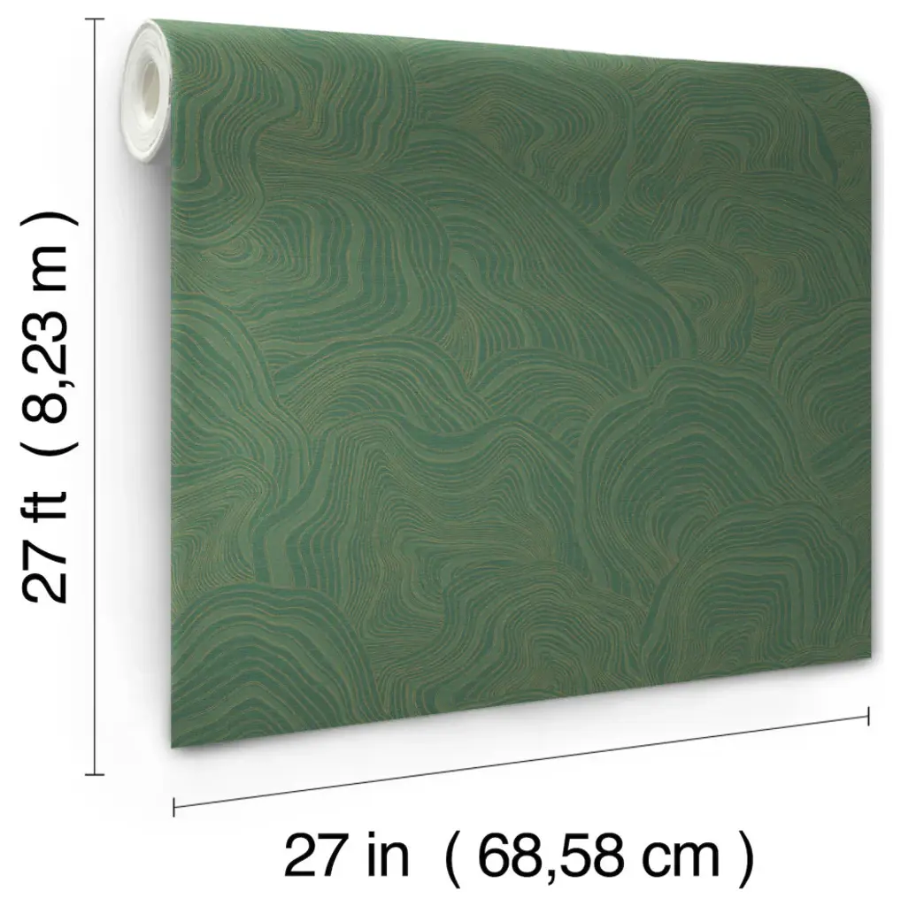 Geodes'' stratified layers are tipped with metallic to create a field of mushrooming shapes that reflect light with warmth and elegance, shown in emerald green with gold metallic. This Geodes Wallpaper measures approximately 27 inches wide by 27 feet long, measuring approximately 60.8 square feet per roll. The distinction of timeless style. Unpasted non woven material. 25.25-in repeat, straight match. Washable and strippable. 27-in by 27-ft long roll. Covers about 60.8 square feet
