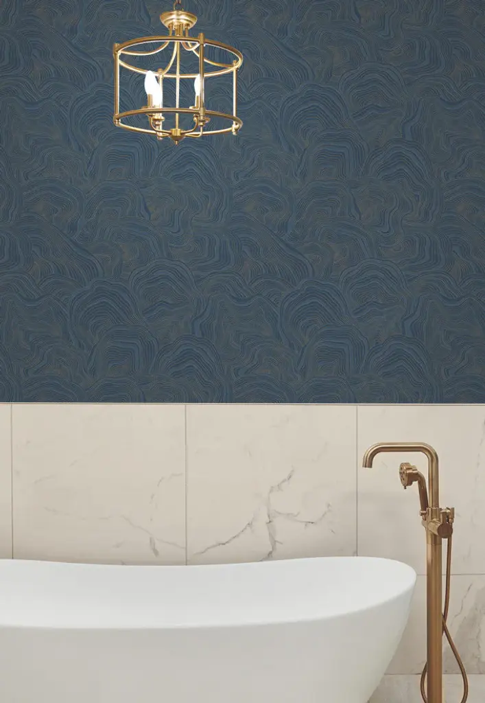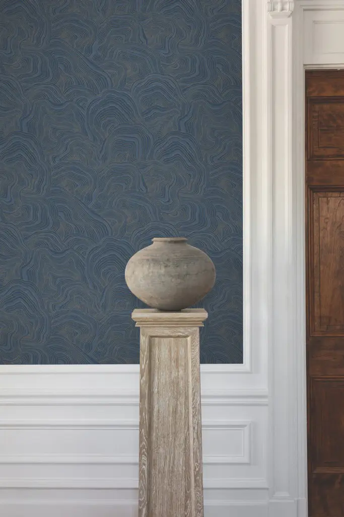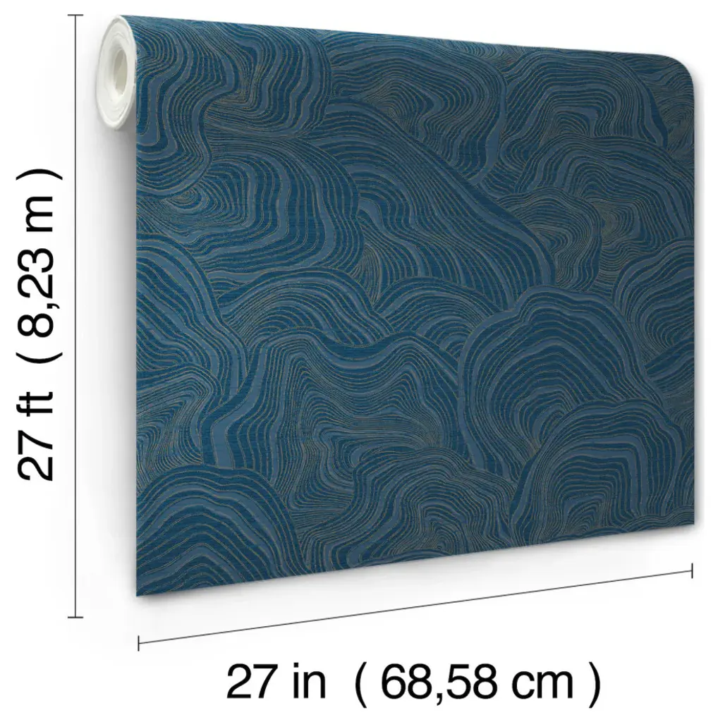 Geode''s stratified layers are tipped with metallic to create a field of mushrooming shapes that reflect light with warmth and elegance, shown in navy blue with gold metallic. This Geodes Wallpaper measures approximately 27 inches wide by 27 feet long, measuring approximately 60.8 square feet per roll. The distinction of timeless style. Unpasted non woven material. 25.25-in repeat, straight match. Washable and strippable. 27-in by 27-ft long roll. Covers about 60.8 square feet