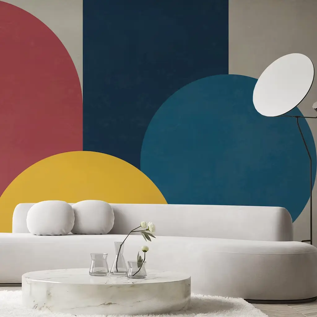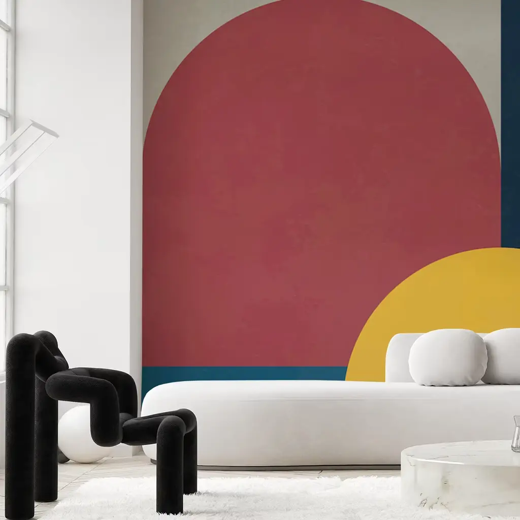 A striking geometric composition enhanced with a bold combination of red, blue, and yellow forms on a light gray backdrop, this extraordinary wallpaper draws inspiration from the study of form and function for which the Bauhaus School is known. Perfect for any interior wall, it is fireproof and unscented, breathable, and hypoallergenic thanks to its cellulose, textile fibers, and vinyl materials. Also available in the ECO or fiberglass variants upon request. The price is per squared meter.