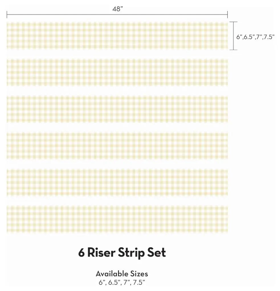 Easily add a farmhouse aesthetic to your staircase with our Gingham Check Peel and Stick Stair Riser Strips! With this modern gingham design achieving a rustic, yet modern look has never been easier.This re-positionable wallpaper is designed and made in our studios in New Jersey. The designs are printed onto an adhesive-backed vinyl that can be removed, repositioned, and reused. The wallpaper does not leave residue on your walls and is ideal for DIY room makeovers without the mess and headaches of traditional wallpaper.Size:48"w x 6"h48"w x 6.5"h48"w x 7"h48"w x 7.5"h