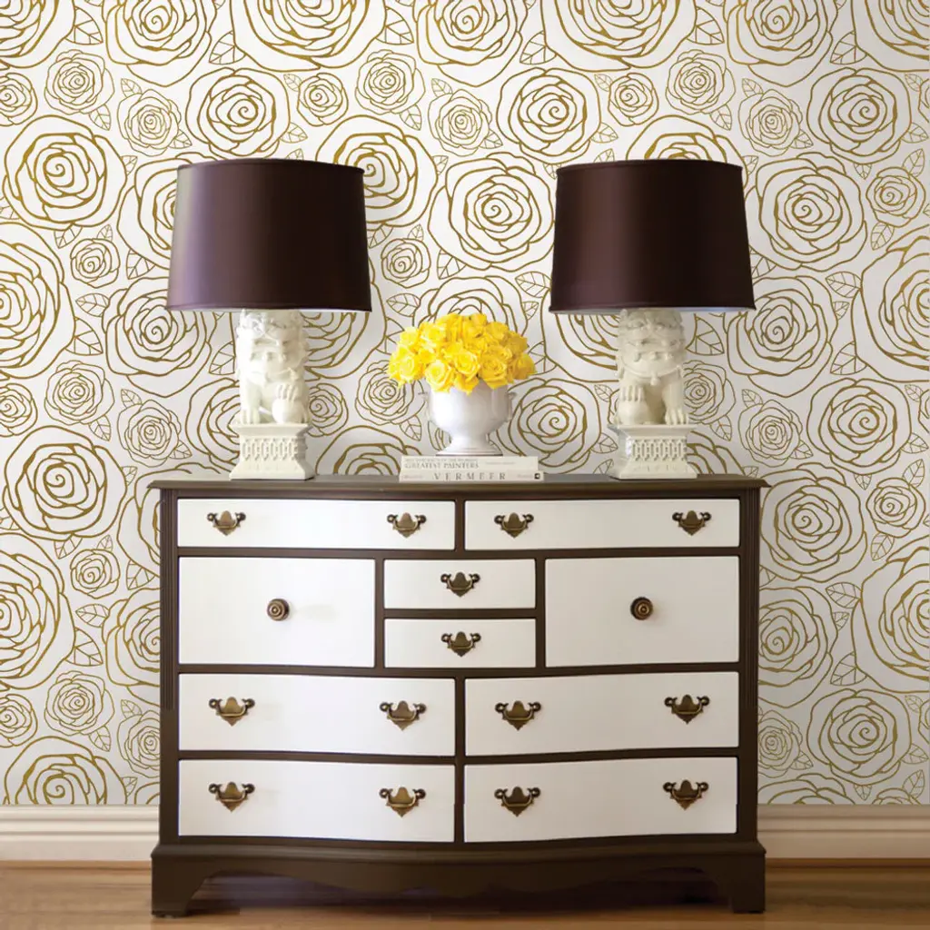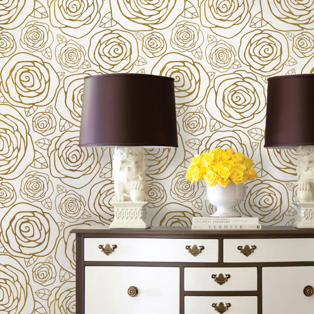 This modern floral Peel-and-Stick Wallpaper features large and small roses with spiraling centers. Use it to add elegance to an accent wall behind a makeup vanity, or to brighten up the inside of a closet. Please note that the Gold color is not metallic.This re-positionable wallpaper is designed and made in our studios in New Jersey. The designs are printed onto an adhesive-backed vinyl that can be removed, repositioned, and reused. The wallpaper does not leave residue on your walls and is ideal for DIY room makeovers without the mess and headaches of traditional wallpaper.Size:24"w x 60"h24"w x 108"hPattern Repeat Length:every 24" What''s Included:1 sheet of peel-n-stick vinyl wallpaper