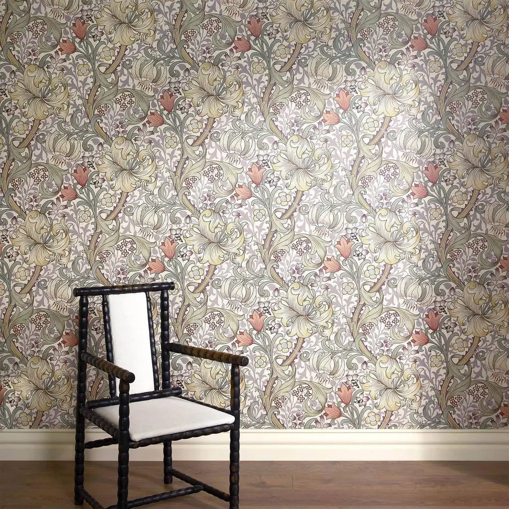 Reimagined for the twenty-first century, the twining lily stems and tendrils of William Morris’ iconic GOLDEN LILY have been painted against a backdrop of neutral cirrus with pops of earthy reds, sage green and golden flax. Texture from Morris’ archive fabric has been woven into the pattern for added depth and richness. This twist on a classic is sure to imbue any space with the timelessness, beauty and a dash of irreverence that Morris evoked in all that he did.