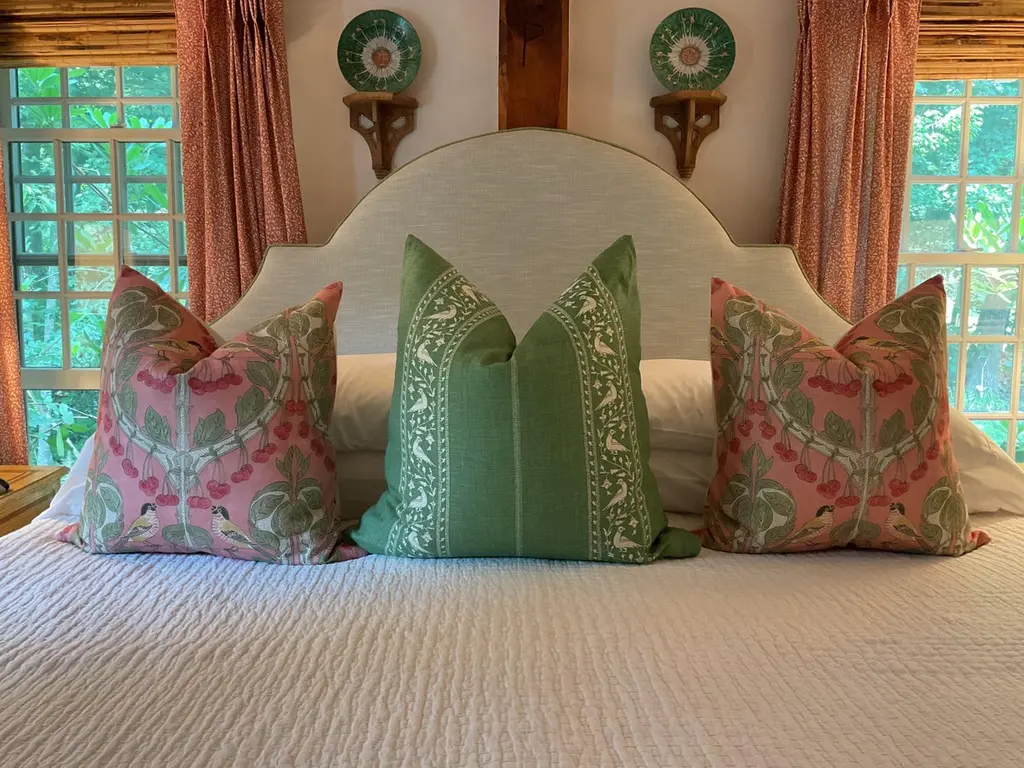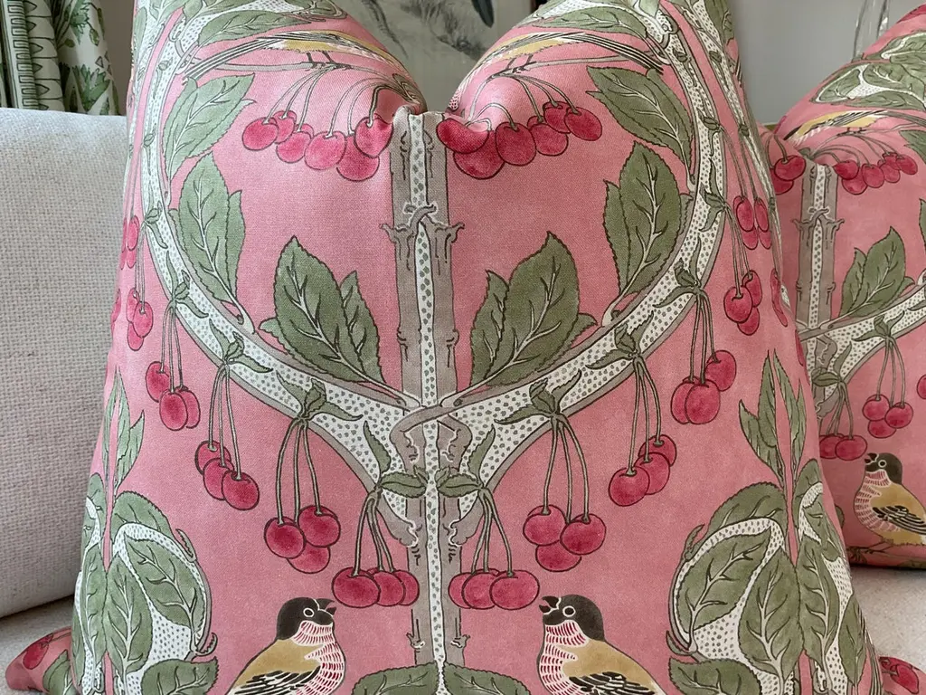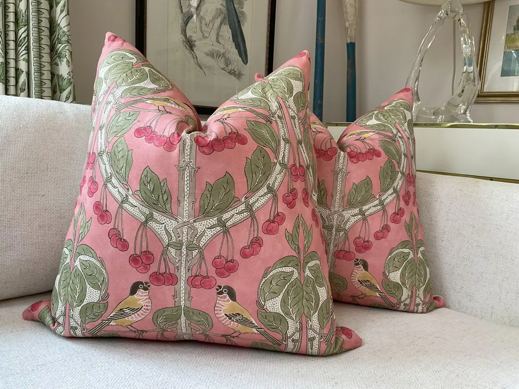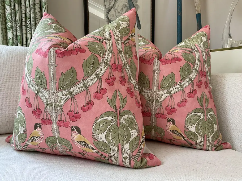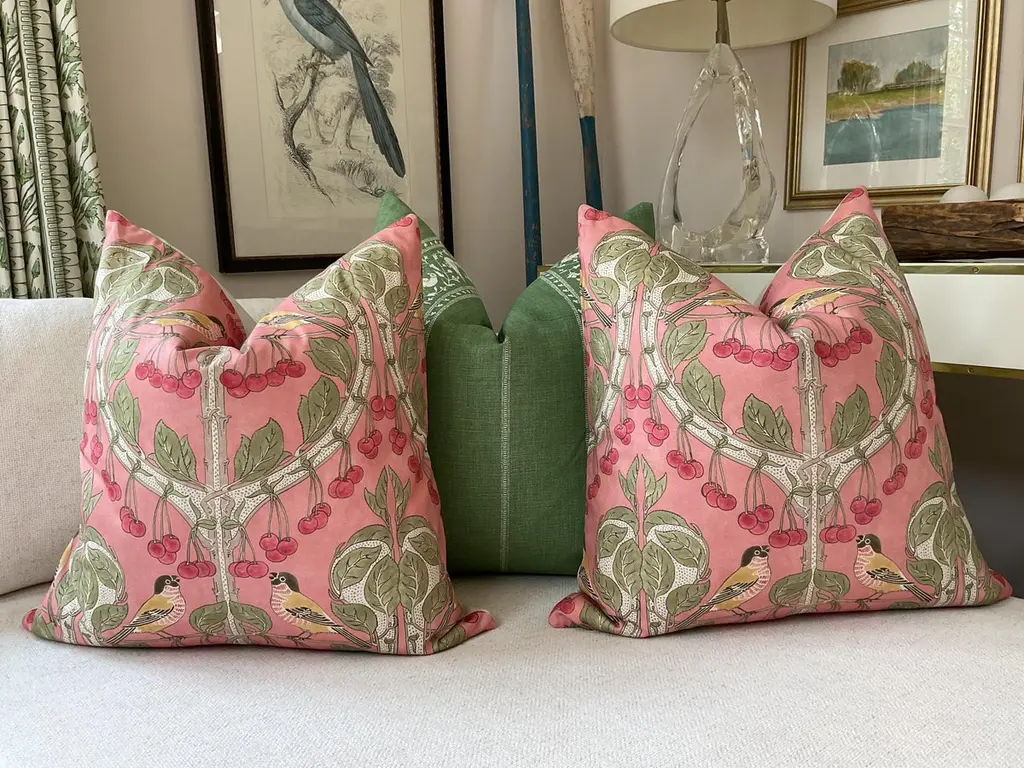 This offering will feature Birds and Cherries by inimitable GP and J Baker in coral on the front with coordinating off white stone back. They will arrive as a 22” pair (2) with generous down inserts. Closure is by way of an invisible zipper.Taken from many unique historical documents in the renowned GP & J Baker archive, ‘Originals Brantwood’ celebrates the famous Arts and Crafts designers through the use of timeless, printed motifs and distinguished stitch work creatively coloured in an enticing palette, ranging from delicate coral and chalky blush pinks to hyacinth blues and vibrant botanical greens. Birds and Cherries is one of their most cherished archives within this collection.WINNER – Homes & Gardens Design Award for Best Reimagined Fabric & Wallpaper CollectionAbout UsAt Accent Marks, each designer pillow is crafted with care using the finest hand-selected fabrics and trims, paired with durable, discreet invisible zippers. We specialize in creating beautiful, high-quality pieces that elevate your home decor. While most of our listings feature 22" pillow pairs, we also offer a range of sizes and single pillow options to suit your needs. All of our Accent Marks pillows are proudly made in the United States.If you don't see the fabric you're searching for, please reach out via message as we have other fabrics available upon request and can create anything that you like. Thank you for visiting Accent Marks!